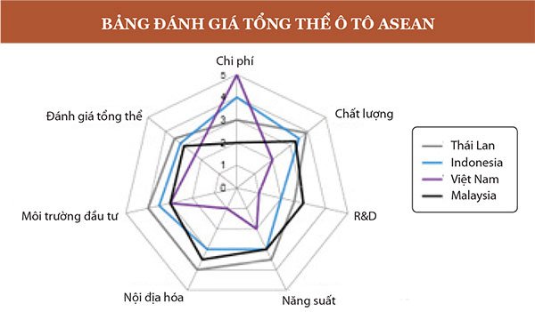 Ngoài giá lao động thấp, Việt Nam đứng cuối sổ trên tất cả mọi tiêu chuẩn, đặc biệt là năng suất và chất lượng, hai yếu tố rất quan trọng của ngành sản xuất ô tô. Điều đáng lo ngại nhất cũng theo đánh giá trên là chất lượng sản phẩm Việt Nam rất thấp: trên 1 triệu linh kiện sản xuất, Việt Nam có tới 200 không đáp ứng mức độ chất lượng đòi hỏi, Philippines 15, Malaysia 12, Thái Lan và Indonesia khoảng 5.