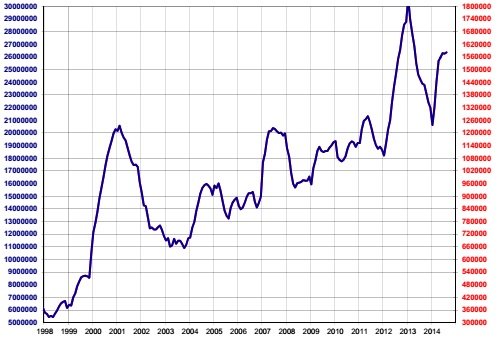 Báo cáo mới nhất của Tổng cục Thống kê (TCTK) cho biết xuất khẩu cà phê trong tháng 8-2014 của nước ta ước đạt 1,5 triệu bao (bao = 60 kg), tăng 7,5% so với cùng kỳ năm 2013. Như vậy, tính cả 11 tháng đầu niên vụ 2013/14, ước cả nước xuất khẩu chừng 25 triệu bao hay tăng 10,22% so với cùng kỳ của mùa trước đó. Riêng trong 8 tháng đầu năm 2014, ước nước ta xuất khẩu được 1,22 triệu tấn hay tăng 26,9% so với cùng kỳ niên năm 2013 (xin xem biểu đồ với cột số màu xanh bên trái biểu thị lượng bao, cột số màu đỏ bên phải biểu thị lượng tấn).