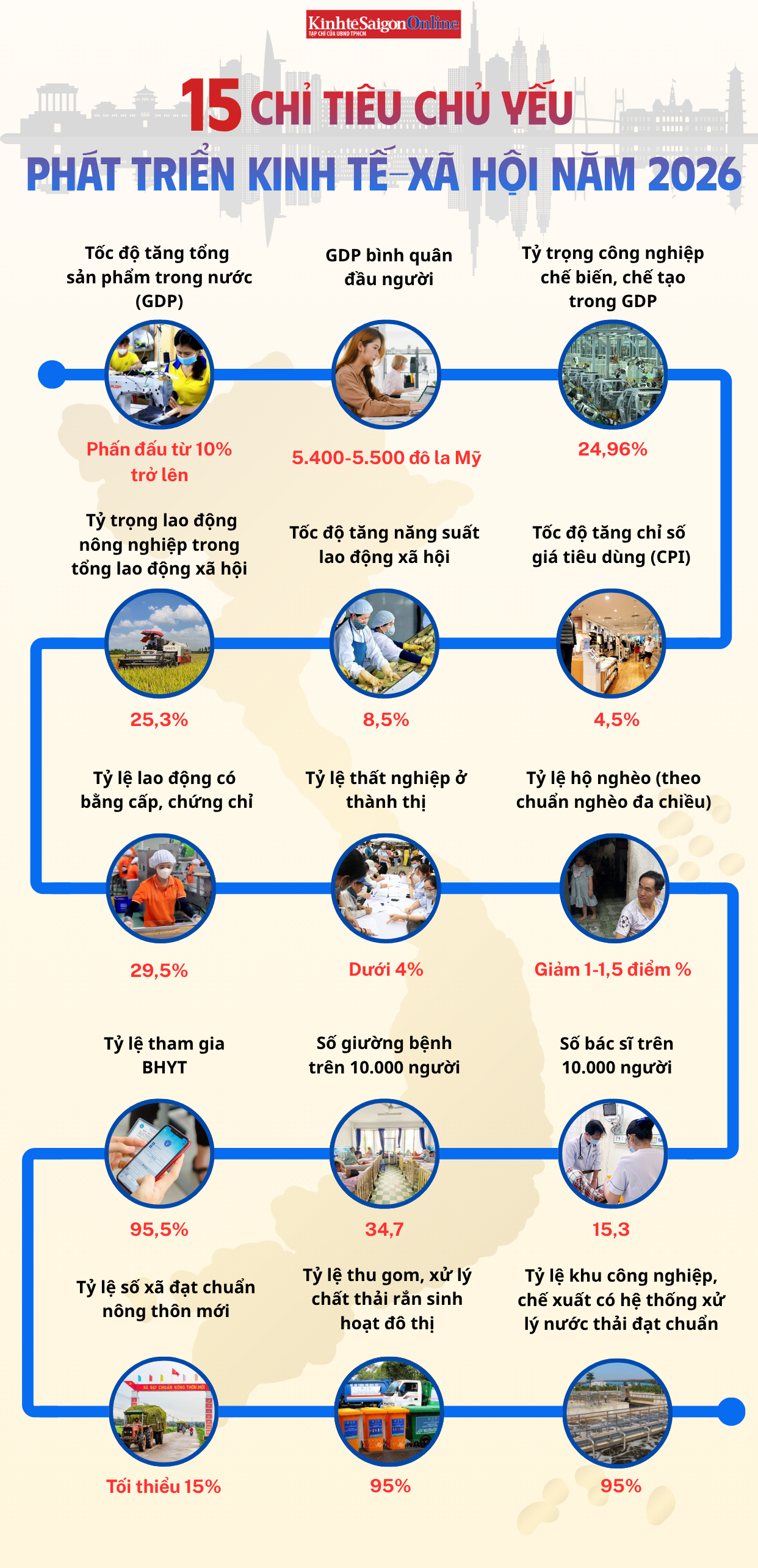 (KTSG Online) - Tại kỳ họp thứ 10, Quốc hội đã thông qua Nghị quyết về Kế hoạch phát triển kinh tế - xã hội năm 2026, với 15 chỉ tiêu chủ yếu gồm tốc độ tăng tổng sản phẩm trong nước (GDP) phấn đấu từ 10% trở lên, GDP bình quân đầu người đạt 5.400-5.500 đô la Mỹ...