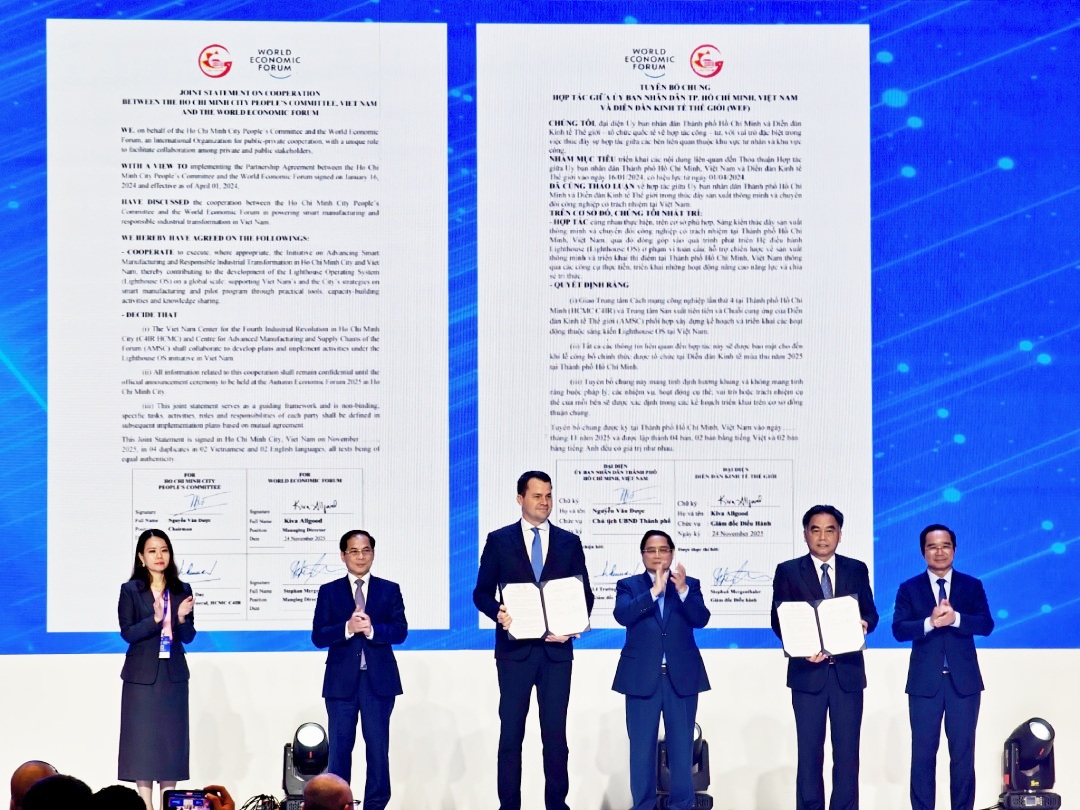 Chiều ngày 26-11, tại Phiên chính thức Diễn đàn Kinh tế mùa Thu năm 2025, TPHCM và Diễn đàn Kinh tế Thế giới (WEF) đã ra Tuyên bố chung về sáng kiến thúc đẩy sản xuất thông minh và chuyển đổi công nghiệp có trách nhiệm tại Việt Nam.