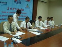 | Lễ ký kết hợp đồng giữa Agifish và các đại diện của Microsoft. Ảnh: Hồ Hùng |