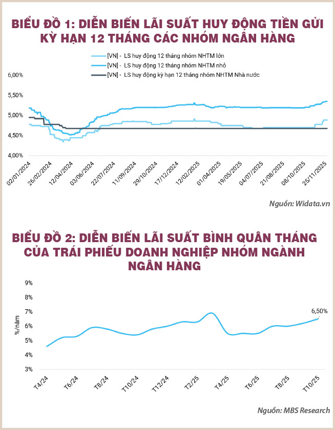 Nhìn tổng thể thì lãi suất huy động tiền gửi của hệ thống ngân hàng vẫn đang duy trì ổn định trong hai năm 2024-2025, từ đó góp phần hỗ trợ cho việc hấp thụ tín dụng của hệ thống. Tuy vậy, phía sau mức lãi suất niêm yết là một chuỗi điều chỉnh nhỏ nhưng liên tục, nhiều ngân hàng thương mại cổ phần đã bắt đầu nhiều đợt tăng lãi suất huy động gần đây, nhất là tại các kỳ hạn từ 6-12 tháng. Đặc biệt, một số ngân hàng quy mô nhỏ đã đưa ra mức lãi suất thực nhận cao hơn nhiều dành cho khách hàng lớn. Những diễn biến này cho thấy chi phí huy động thực tế đang tăng nhanh hơn so với trên danh nghĩa.