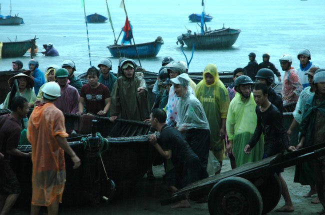 Ngư dân vùng biển thành phố Đà Nẵng kéo ghe thuyền bào bờ neo đậu chống bão - Ảnh: Thạnh Lộc |