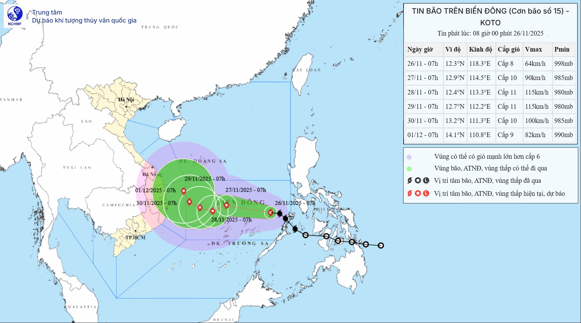 (KTSG Online) – Theo Trung tâm Dự báo khí tượng thuỷ văn quốc gia, bão số 15 sẽ có khả năng mạnh thêm. Cường độ có thể lên đến cấp 11, giật cấp 14.