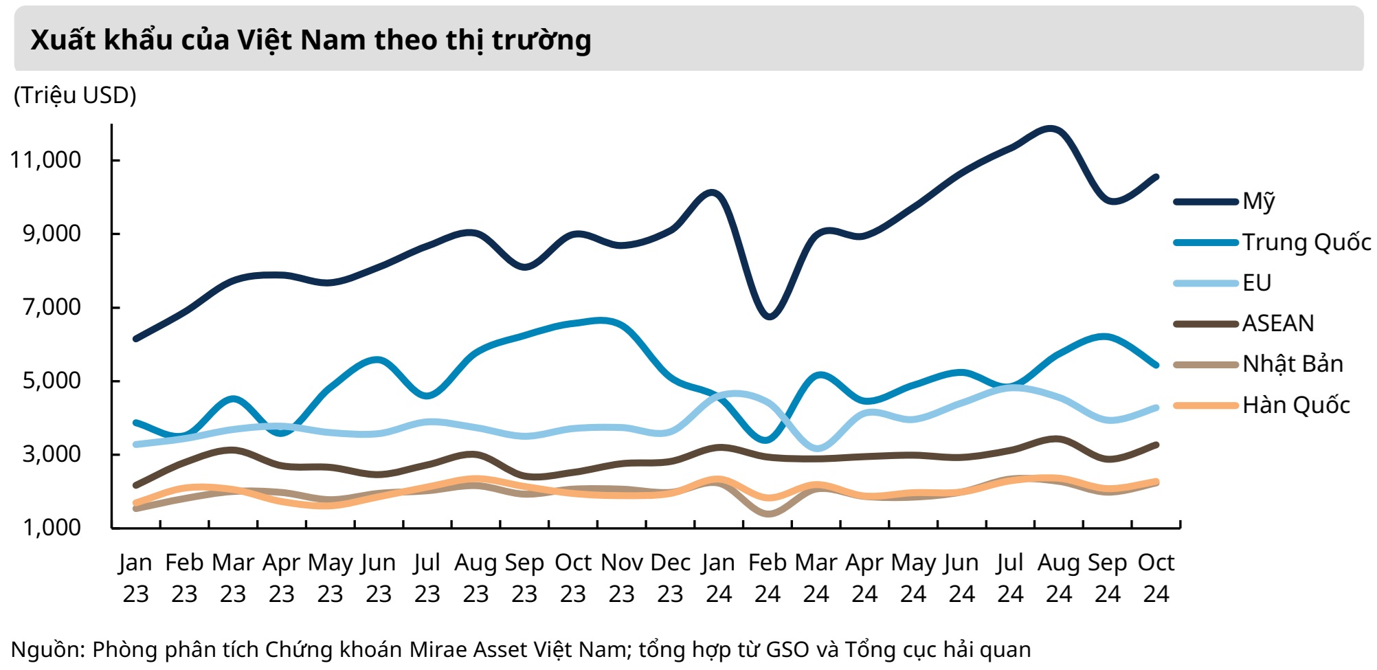 Thứ nhất là tăng trưởng xuất khẩu trong năm nay tích cực một phần dựa vào mức nền yếu của năm trước. Mặt khác, triển vọng năm 2025 có thể không được duy trì như năm nay vì thị trường thế giới hạ nhiệt và ẩn số chính quyền mới của Mỹ. Theo ông Hùng, lo ngại về việc áp đặt hạn chế thương mại vẫn chưa rõ ràng, nhưng chắc chắn sẽ có ảnh hưởng tới thương mại thế giới.