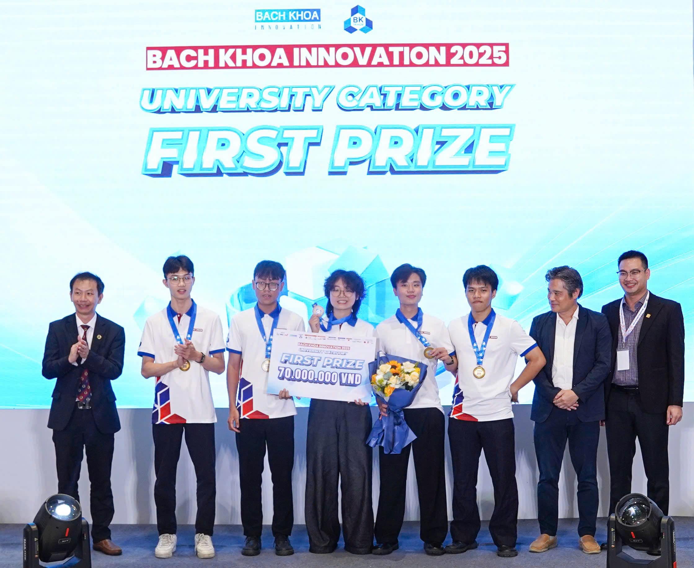 Nhóm sinh viên Đại học Kinh tế TPHCM dành giải nhất cuộc thi Bach khoa Innovation 2025. Ảnh: BTC