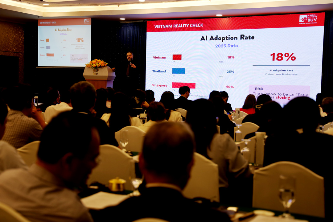 Theo các thống kê được chia sẻ tại hội thảo, tỷ lệ doanh nghiệp Việt Nam ứng dụng AI hiện chỉ khoảng 18%, thấp hơn đáng kể so với Thái Lan (25%) và Singapore (40%), chưa kể khoảng cách rất xa so với các trung tâm sản xuất tiên tiến trên thế giới. Điều này cho thấy Việt Nam đã bỏ lỡ giai đoạn "đi sớm" trong ứng dụng AI.