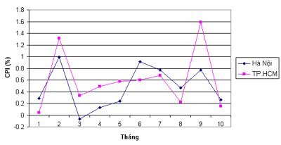 | Chiều hướng của chỉ số giá tiêu dùng tại Hà Nội và TPHCM trong 10 tháng qua. |