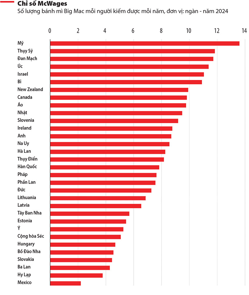 Trong số các nước OECD tờ Economist khảo sát, lương công nhân Mỹ mua được nhiều Big Mac nhất. Mức lương điển hình ở nước này có thể mua được 13.601 Big Mac mỗi năm, nhiều hơn nước đứng thứ nhì là Thụy Sỹ đến 1.775 chiếc. Nhưng tính ra công nhân Mỹ làm nhiều giờ trong năm hơn các nước châu Âu. Tính theo giờ, Đan Mạch xếp hạng nhất trong chỉ số McWages, lương mỗi giờ mua được 8,5 chiếc Big Mac so với 7,7 chiếc mà dân Thụy Sỹ mua được sau mỗi giờ làm việc và 7,6 chiếc của dân Mỹ. Tờ Economist nhận định cách tính toán chỉ số lương kiểu “nửa đùa, nửa thật” này hóa ra cũng khớp với các xếp hạng truyền thống khác như bảng xếp hạng các nước giàu nhất, cũng của tờ báo này thực hiện, dựa trên đo lường GDP và sức mua tương đương.