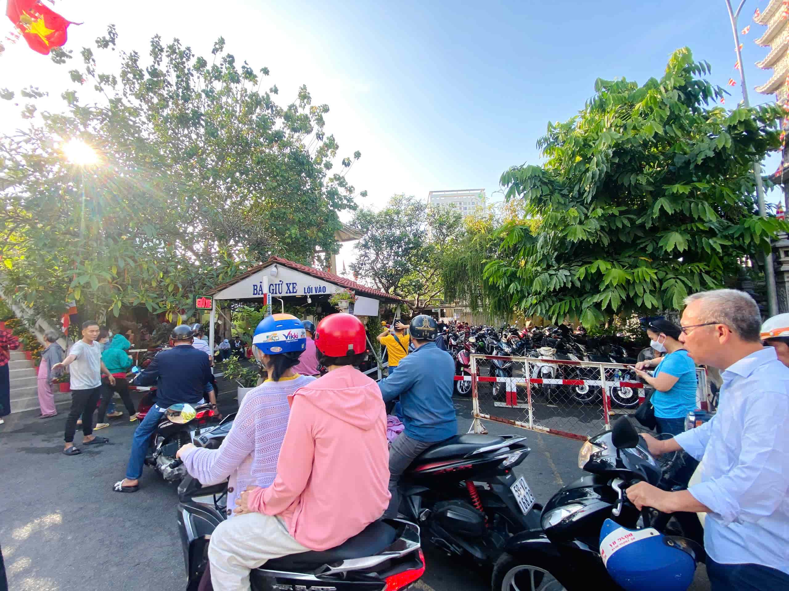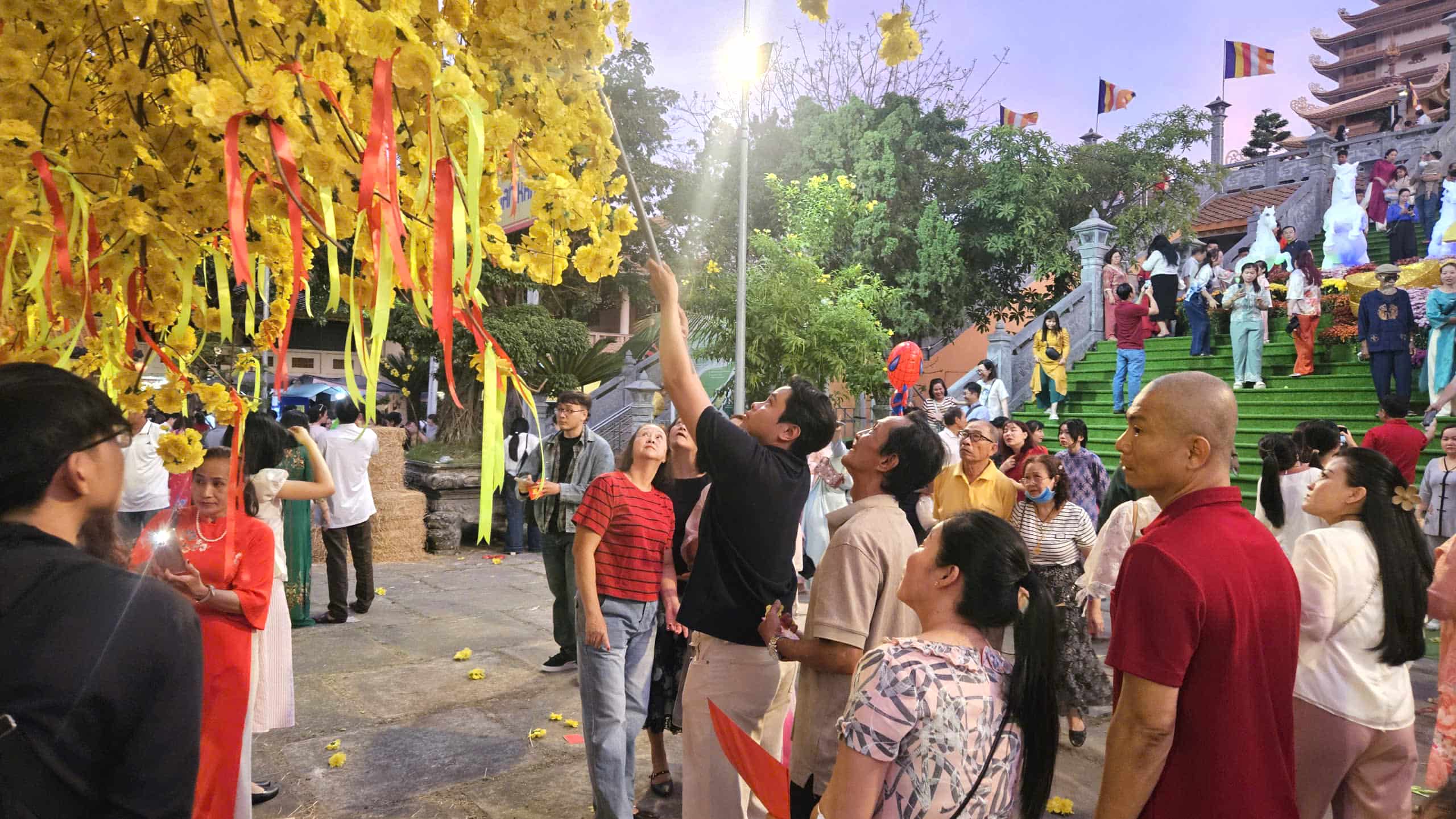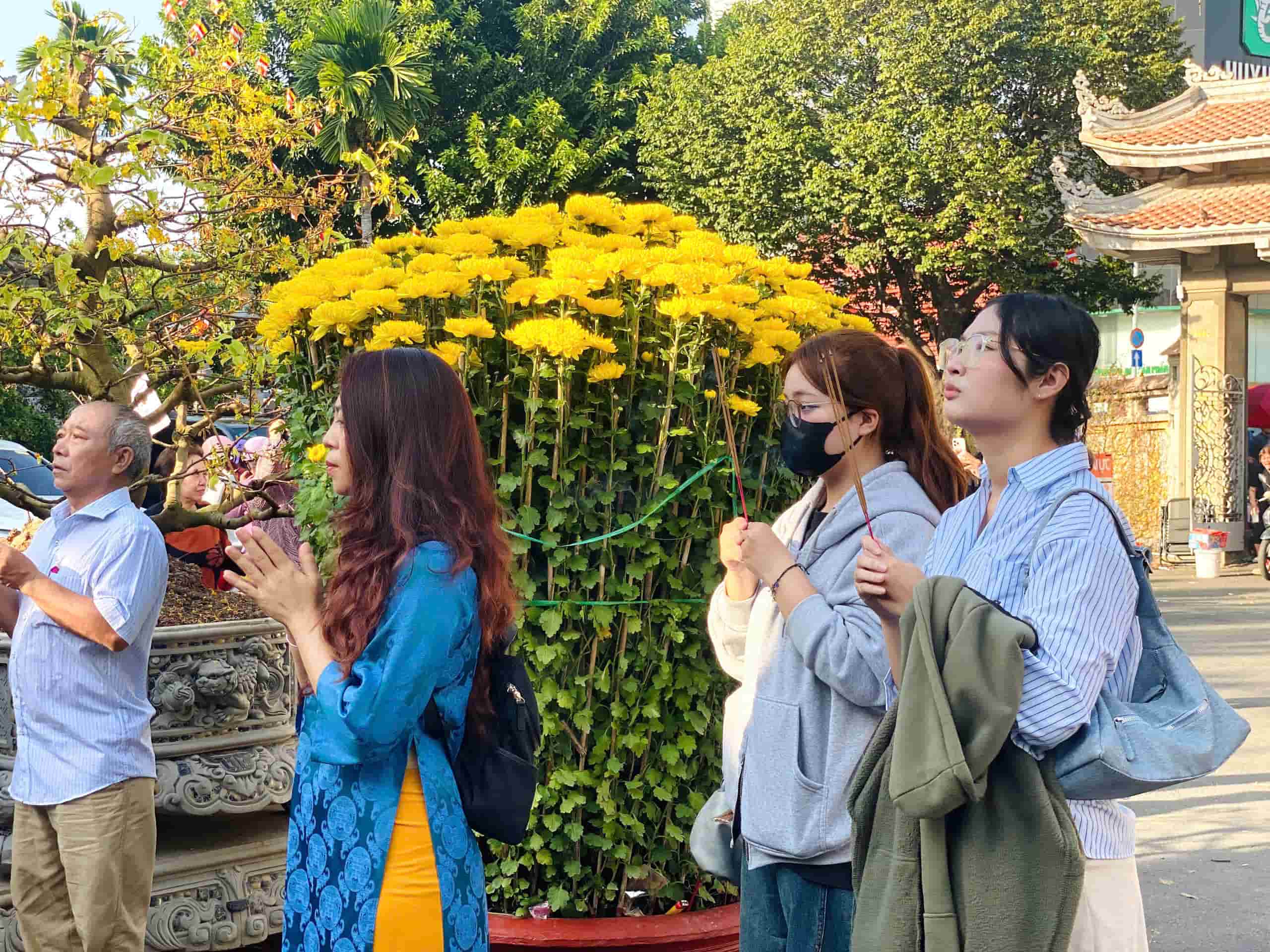 Càng về đến chiều tối, khuôn viên một số chùa càng chật kín người dân tìm đến để thắp nhang, dâng lễ. Hàng trăm người nối đuôi nhau khắp sân chùa, ai nấy đều tay cầm hoa tươi và nhang đèn, thành kính trước khi bước vào không gian chính điện với ước muốn cầu cho một năm mới bình an, may mắn.