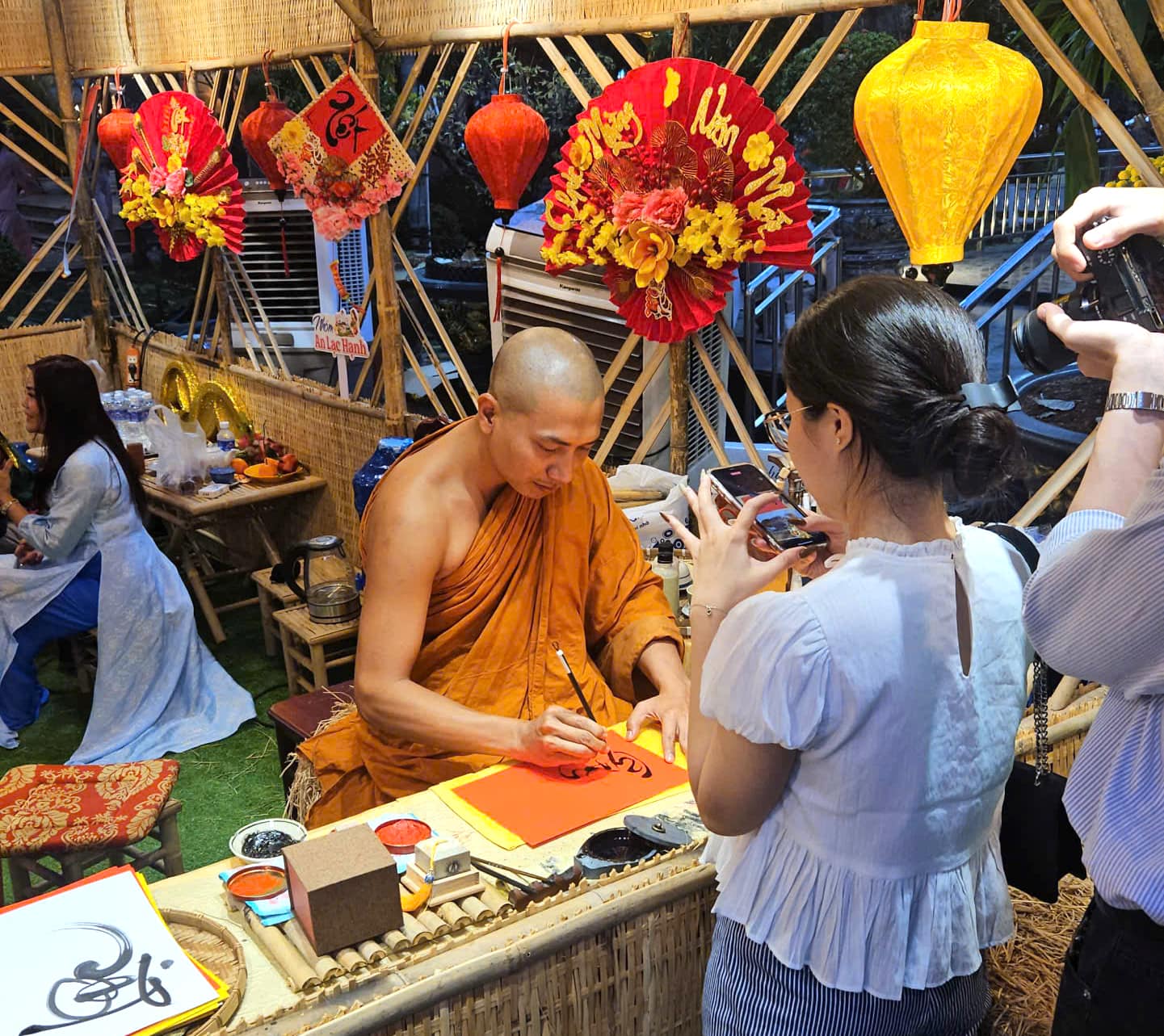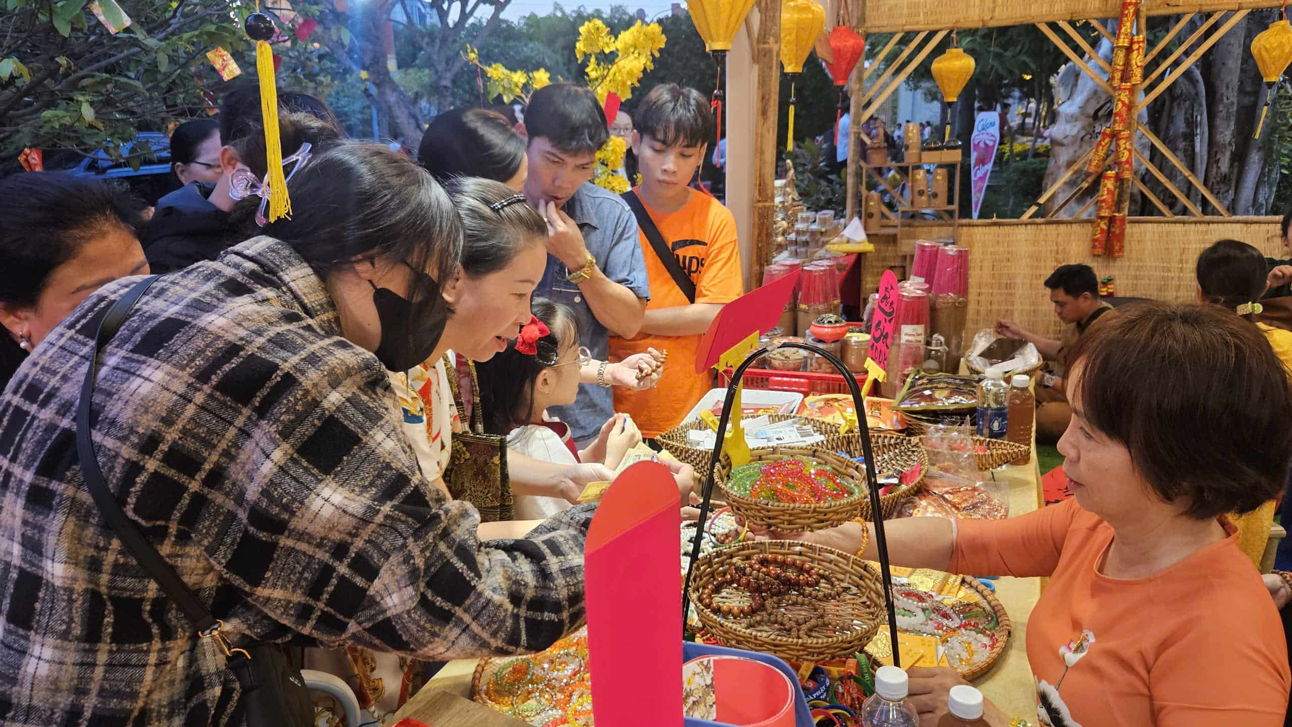 Càng về tối, dòng người đổ về khuôn viên Pháp viện Minh Đăng Quang càng đông nghịt. Nhiều gia đình tranh thủ sau bữa cơm chiều đến lễ Phật, thắp hương và hái lộc đầu xuân, cầu mong một năm mới bình an.Người dân xếp hàng xin chữ đầu năm.Theo ghi nhận, phần lớn người dân đến chùa mùng 2 Tết không mang theo lễ vật cầu kỳ. Hoa tươi, trái cây đơn giản, nén nhang thơm là đủ để bày tỏ lòng thành. Nhiều người chia sẻ, đi chùa đầu năm chủ yếu để tìm sự an yên trong tâm hồn, gác lại lo toan của năm cũ và hướng tới những điều tích cực hơn.