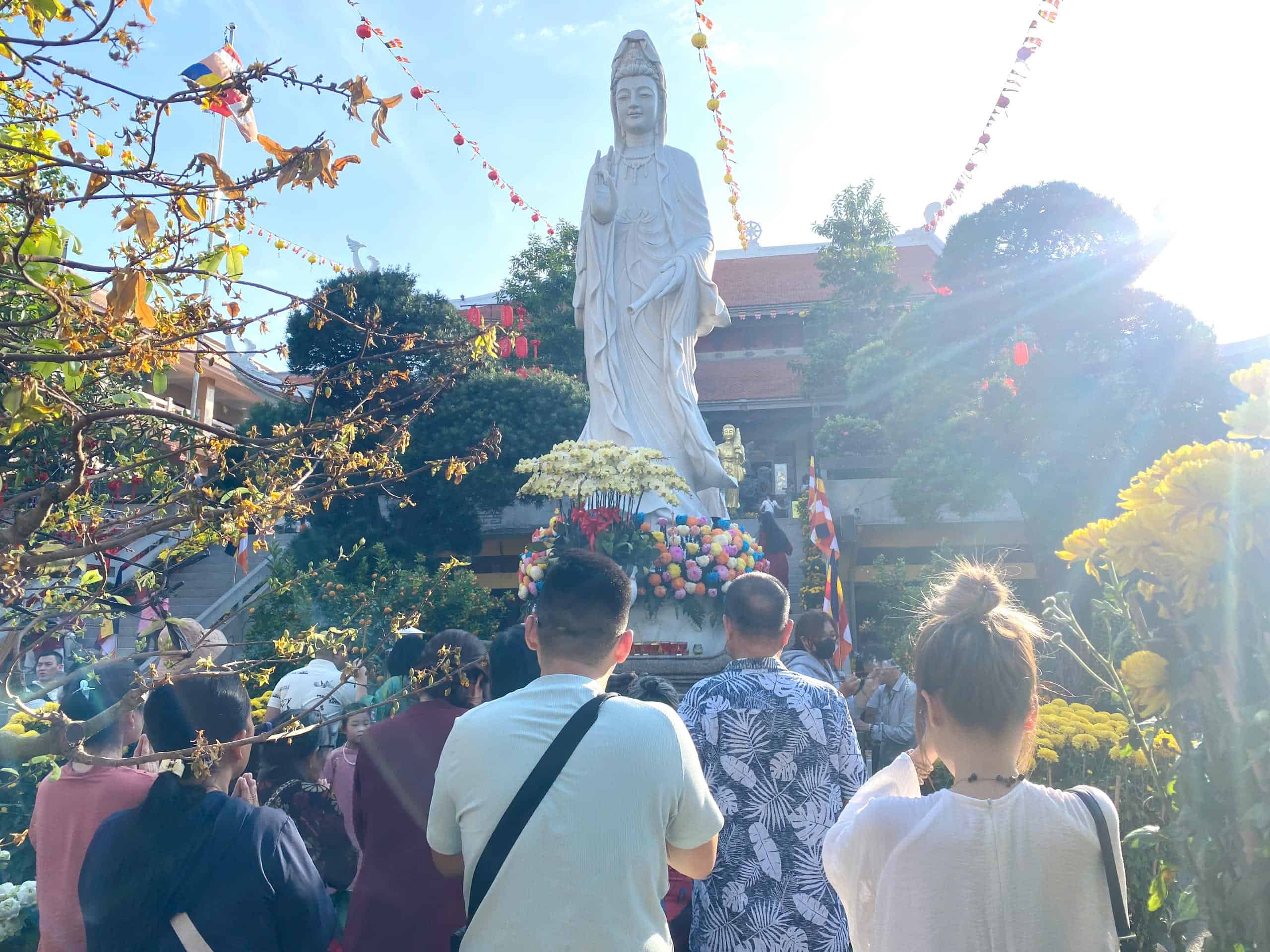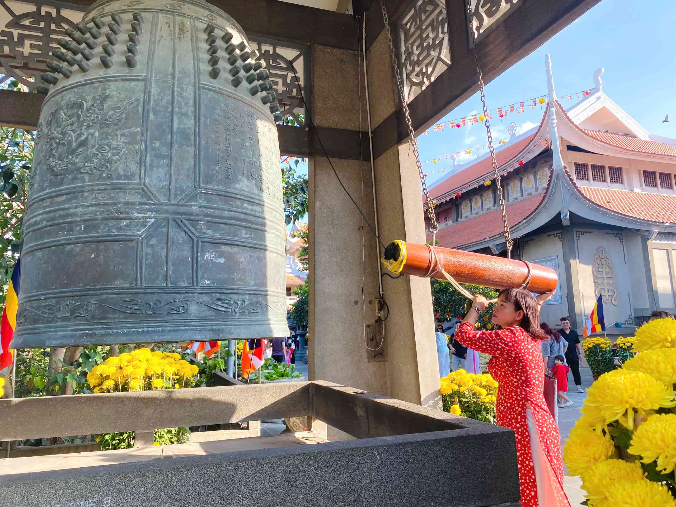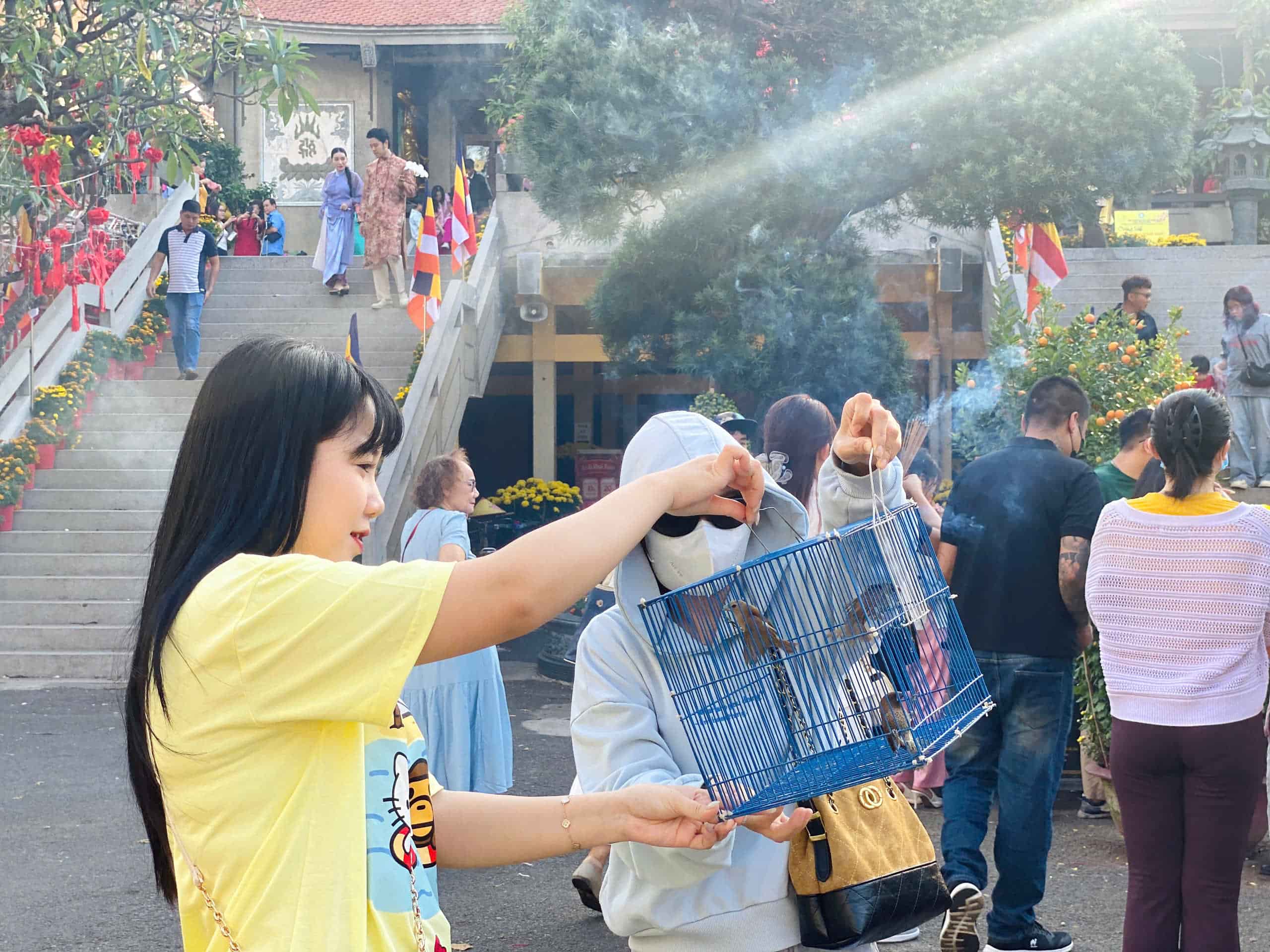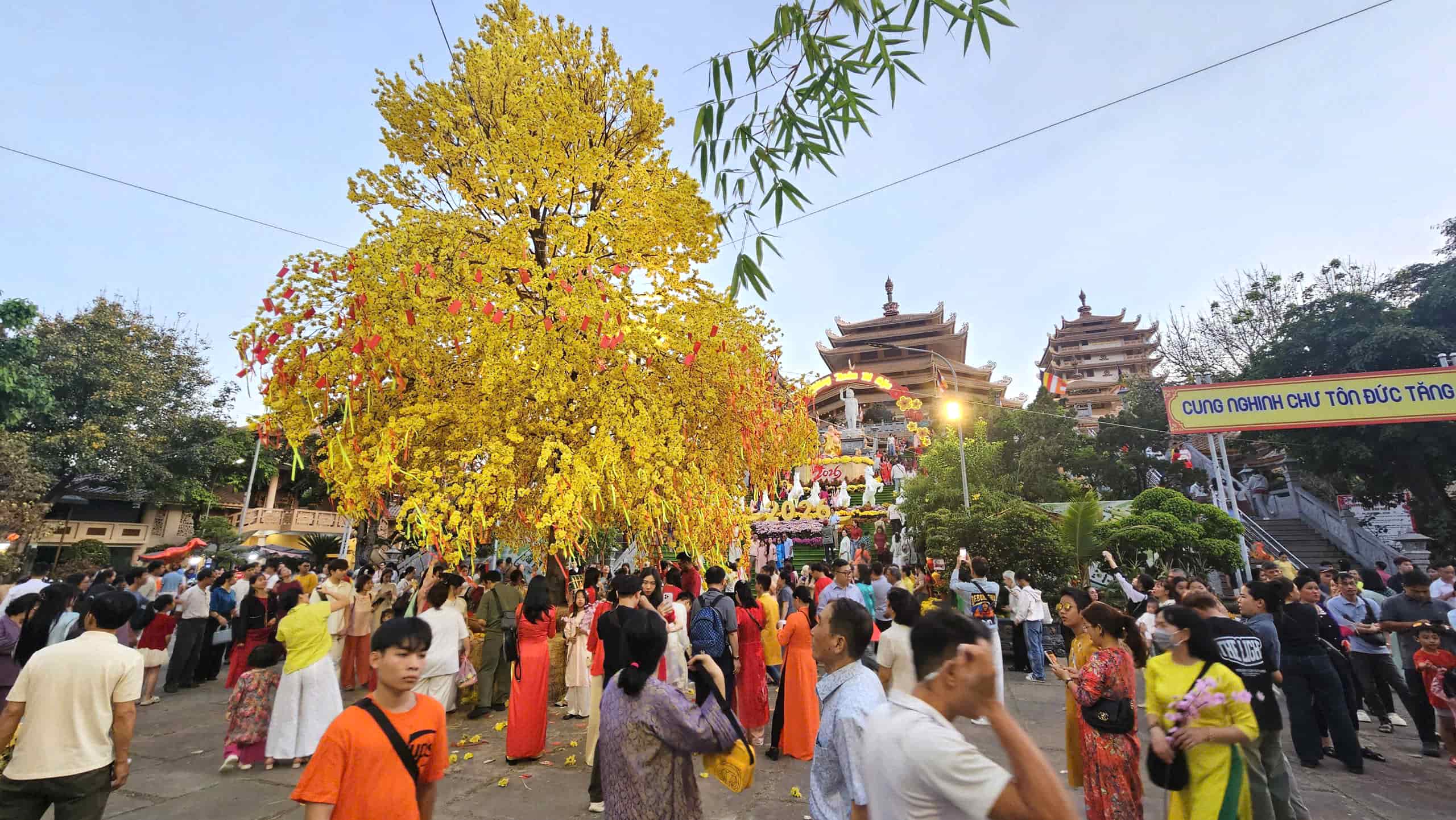 Tại chùa Vĩnh Nghiêm (phường Xuân Hoà), dù là chiều mùng 2 Tết nhưng có rất đông người dân và du khách đổ về đây để cầu bình an, tài lộc và hạnh phúc trong năm mới.Các xe máy nối đuôi nhau để chờ vào bãi xe của chùa. Vào những ngày đầu năm, giá vé gửi xe ở đây cũng tăng lên 10.000 đồng/chiếc thay vì 6.000 đồng/chiếc so với những ngày thường.Nhiều gia đình diện áo dài, mang theo lễ vật như hoa tươi, trái cây, bánh kẹo để dâng cúng. Trong chính điện, người dân thành tâm thắp hương, khấn nguyện một năm mới nhiều sức khỏe, công việc thuận lợi.Ai ai cũng thành tâm cầu khấn xin cho bản thân và gia đình năm mới mạnh khỏe, an lành, gặp nhiều may mắn.Ngoài thắp hương lễ Phật, nhiều người dân xếp hàng chờ đợi được gõ chuông chùa. Trong kinh điển Phật giáo, tiếng chuông chùa còn có ý nghĩa thức tỉnh bản giác của con người. Đó là tính thiện, từ bi hỷ xả; là cái vô ngã, đức vị tha.Sau khi hành lễ, một số gia đình còn thực hiện nghi thức phóng sinh cá, chim với quan niệm cầu phúc, tích thiện đầu năm.Nhiều người dân cũng tranh thủ ghi lại những khoảnh khắc đẹp tại một số tiểu cảnh Tết trong chùa Vĩnh Nghiêm.Còn tại Pháp viện Minh Đăng Quang (phường Bình Trưng), chiều mùng 2 Tết, dòng xe bắt đầu đổ về khu vực xung quanh pháp viện, từng nhóm người, gia đình nhỏ tay cầm hoa, nhang lễ nối nhau đi vào bên trong.Điểm thu hút đông đảo người dân và du khách là hoạt động hái lộc đầu xuân.