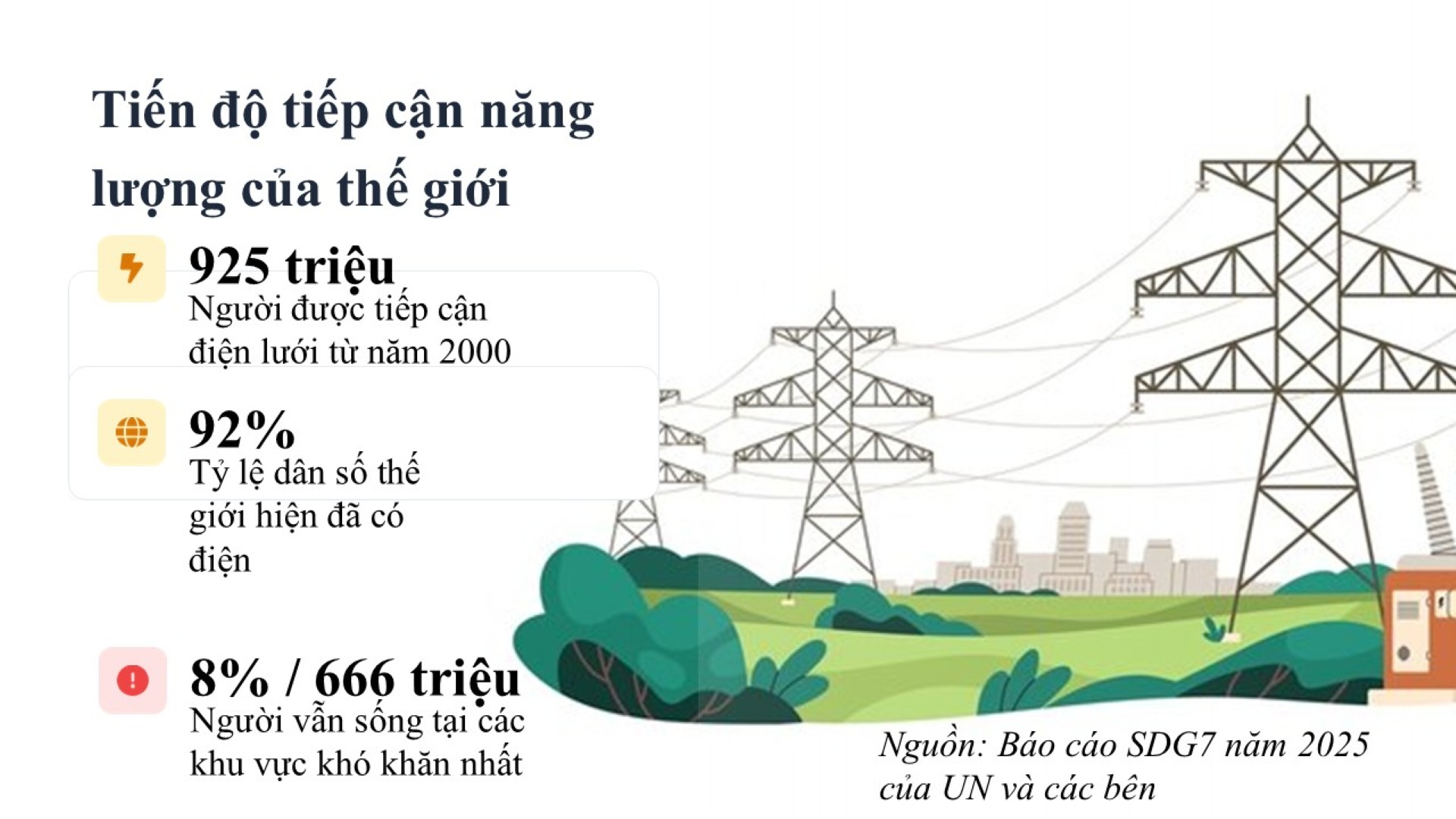 Theo báo cáo Mục tiêu Phát triển Bền vững số 7 năm 2025 (SDG7 - mục tiêu về năng lượng sạch và giá rẻ cho tất cả mọi người), thế giới đã giúp hơn 925 triệu người tiếp cận được điện lưới kể từ đầu thế kỷ này. Đây là một nỗ lực lớn, nâng tỷ lệ có điện toàn cầu lên mức 92%.
