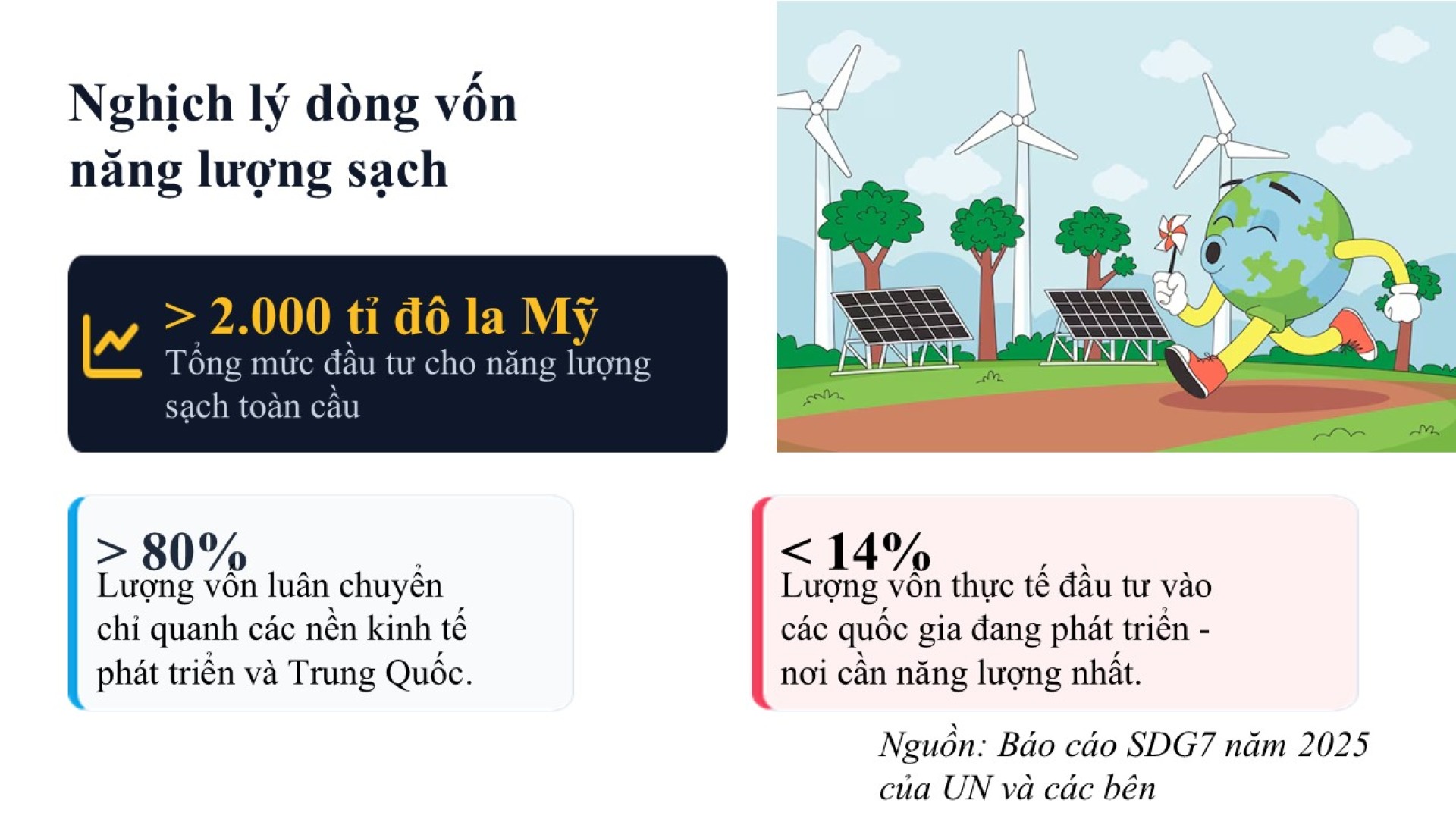 Nếu công nghệ đã sẵn có và hiệu quả đã được chứng minh, tại sao lộ trình này vẫn gặp nhiều lực cản? Câu trả lời nằm ở sự lệch pha nghiêm trọng của dòng vốn đầu tư toàn cầu. Báo cáo SDG7 năm 2025 chỉ ra một thực tế. Dù tổng đầu tư cho năng lượng sạch đã vượt mức kỷ lục 2.000 tỉ đô la Mỹ, nhưng hơn 80% số vốn này lại chỉ luân chuyển quanh các nền kinh tế phát triển và Trung Quốc. Các quốc gia đang phát triển, nơi cần năng lượng sạch nhất để thoát nghèo, hiện chỉ nhận được chưa đầy 14% lượng vốn đầu tư.