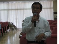 | Tiến sĩ Huỳnh Quyền đang phát biểu. Phía sau là những hàng ghế trống cho thấy một sự thiếu quan tâm của giới doanh nghiệp với vấn đề này. Ảnh: Phi Tuấn |