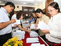 | Phiếu tham dự đấu giá của MHB đang được kiểm tra tại Sở Giao dịch chứng khoán TPHCM sáng 20-7. Ảnh: Lê Toàn |