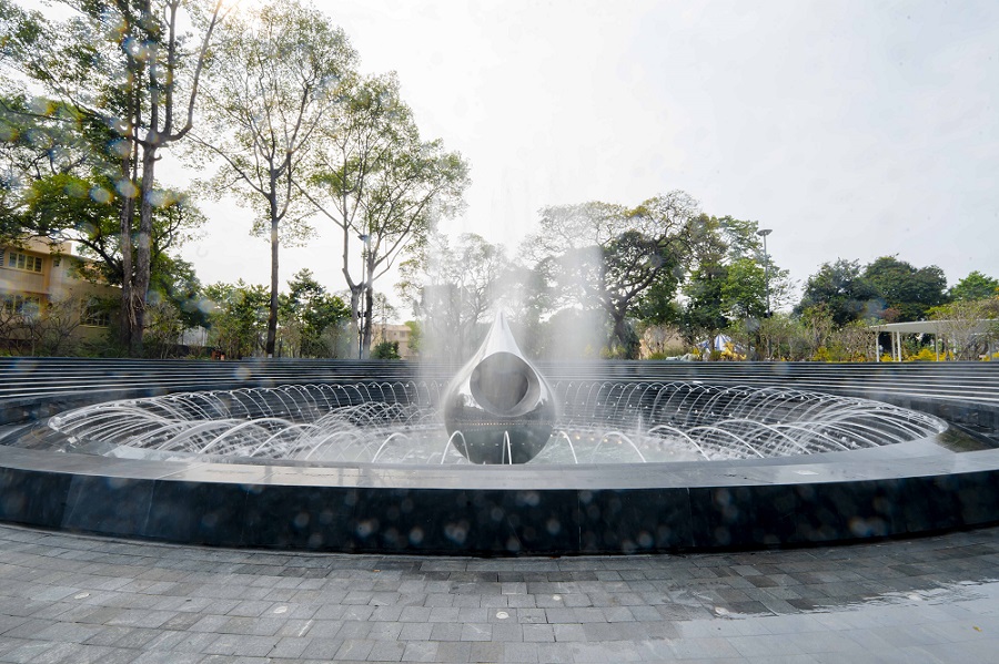 Điểm nổi bật của công trình là biểu trưng hình giọt nước được lắp đặt tại vị trí trung tâm hồ nước của quảng trường chính.