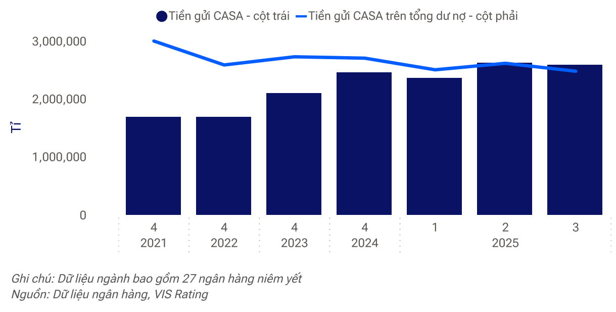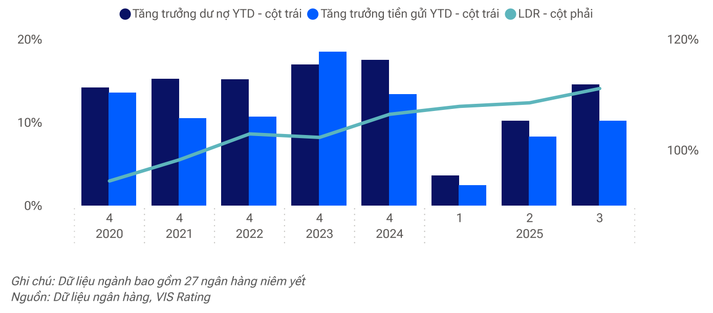 Sự lo ngại tiếp tục nằm ở các ngân hàng quy mô nhỏ. “Áp lực thanh khoản thể hiện rõ nhất ở các ngân hàng nhỏ và có khả năng sẽ tiếp tục kéo dài trong bối cảnh các ngân hàng này phụ thuộc ngày càng nhiều vào nguồn vốn thị trường ngắn hạn và nhu cầu tín dụng cao”, báo cáo VIS Ratings đánh giá. Tỷ lệ cho vay trên tiền gửi khách hàng (LDR) của toàn ngành đạt mức cao nhất trong 5 năm là 111%, do tăng trưởng tín dụng mạnh vượt xa tốc độ tăng trưởng tiền gửi.