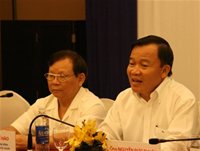 | Ông Nguyễn Đức Thuấn (trái), Chủ tịch Hiệp hội da giày Việt Nam trả lời báo chí hôm 18-8 - Ảnh: Thu Nguyệt |