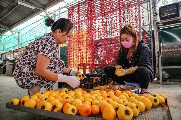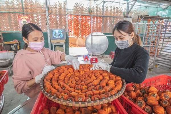 | Những trái hồng già sau thu hoạch sẽ được sơ chế rửa sạch, gọt vỏ, sấy bằng quạt điện khoảng 3 tiếng ở nhiệt độ từ 50 - 60oC, sau đó được treo thành dây để gió sấy tự nhiên trong thời gian khoảng 3 tuần. |
