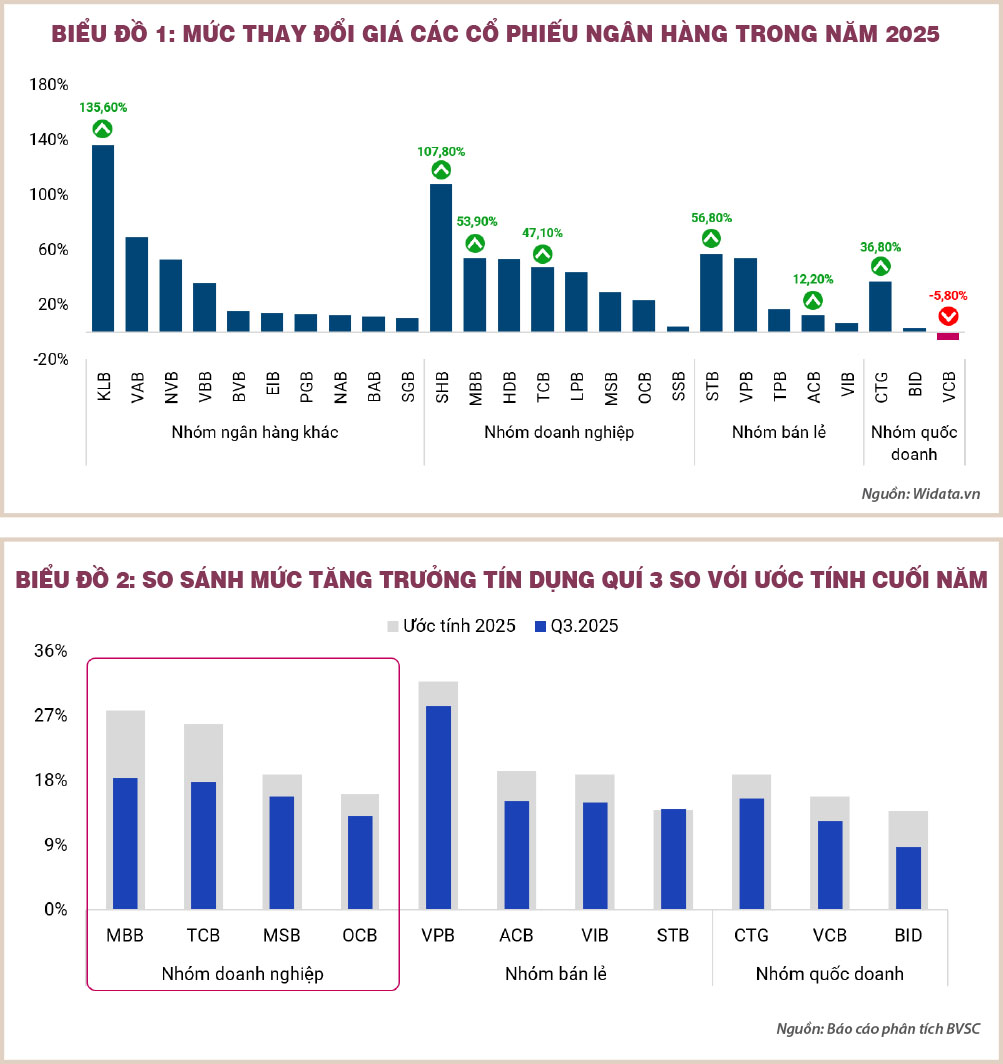 Năm 2025 ghi nhận sự bứt phá mạnh mẽ của nhiều cổ phiếu ngân hàng, thậm chí có những mã tăng với biên độ rất lớn, phản ánh kỳ vọng cao của dòng tiền vào chu kỳ tín dụng mới. Tuy nhiên, mức tăng không diễn ra đồng đều giữa các ngân hàng mà có sự chênh lệch rõ rệt, cho thấy thị trường đang định giá dựa trên kỳ vọng riêng cho từng mô hình kinh doanh.