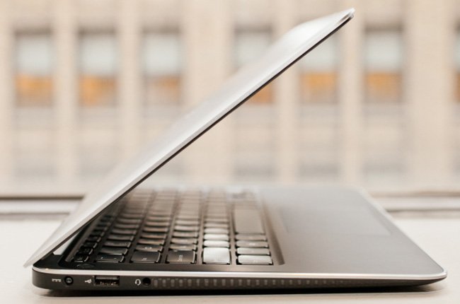 Ngoài ra, Dell XPS 13, nặng 1,35 kg, cũng được theo xu hướng thiết kế bằng nhôm với sợi carbon tạo cho bộ vỏ ngoài bóng loáng nhưng chắc chắn dù rất mỏng. Điểm mỏng nhất của chiếc máy này là 0,24 inch và đạt 0,71 inch ở điểm dày nhất.
