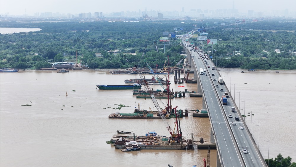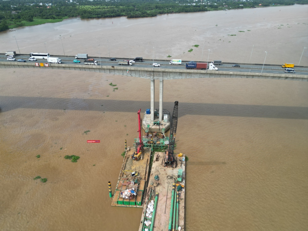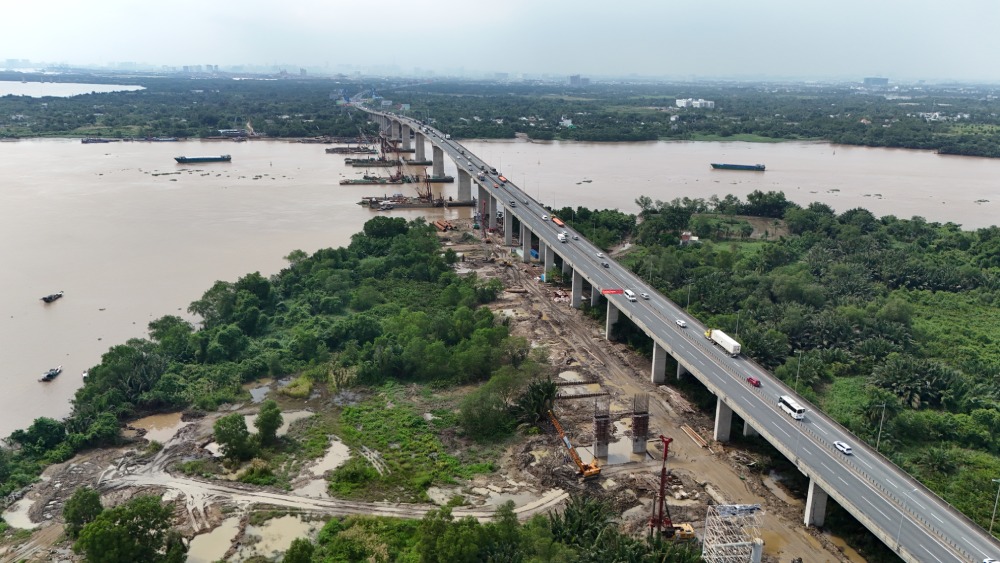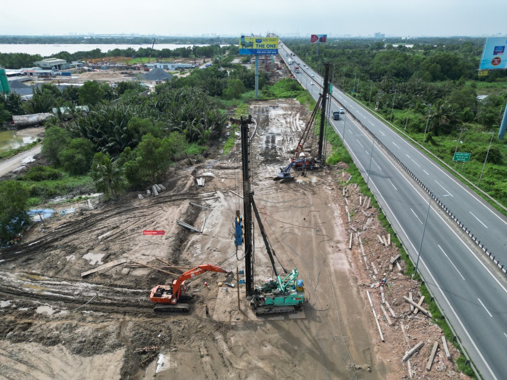 Trên bờ Đồng Nai, các nhà thầu đang triển khai các hạng mục cầu cạn, với máy móc và thiết bị được bố trí dọc tuyến từ Km13+900 đến Km25+920, từ nút giao vành đai 2 TPHCM đến gần cầu Long Thành.