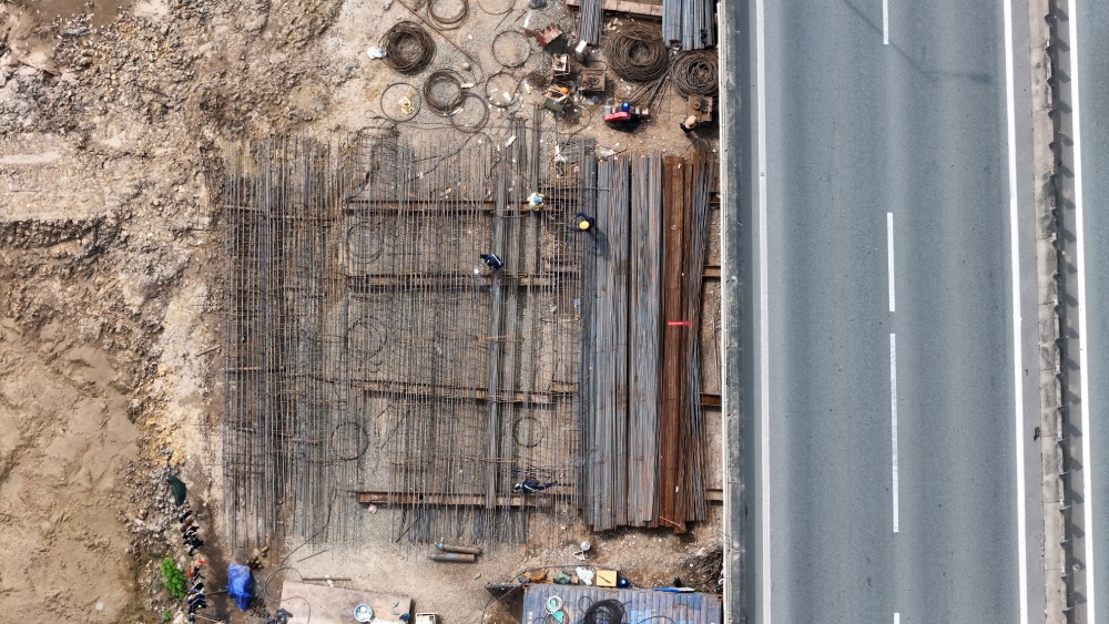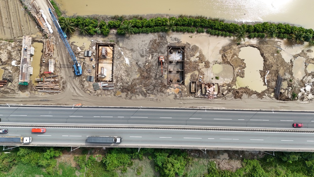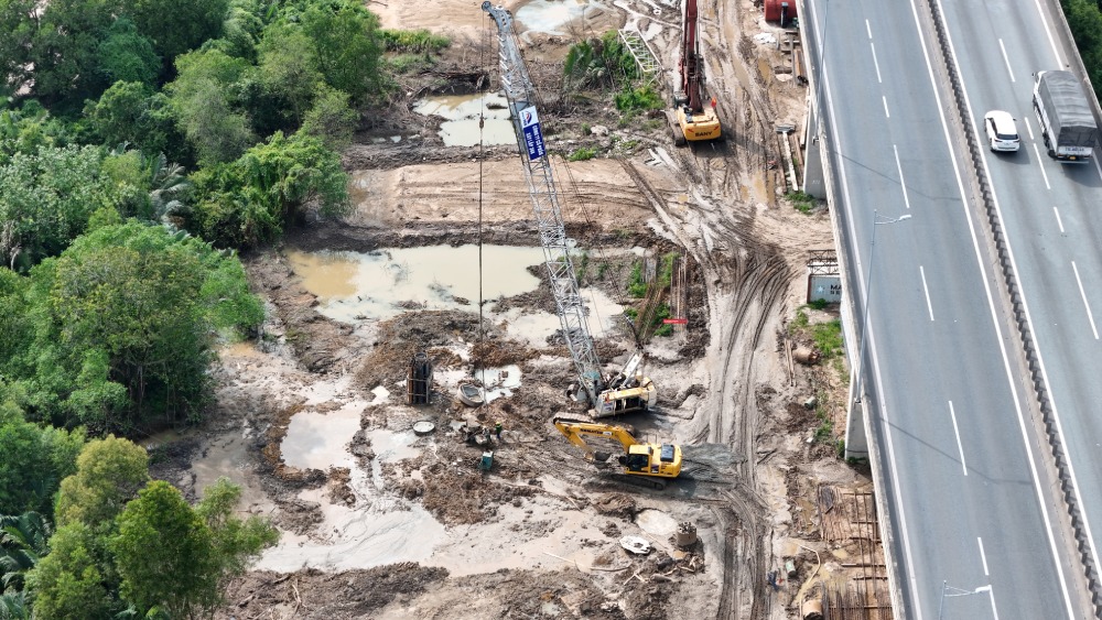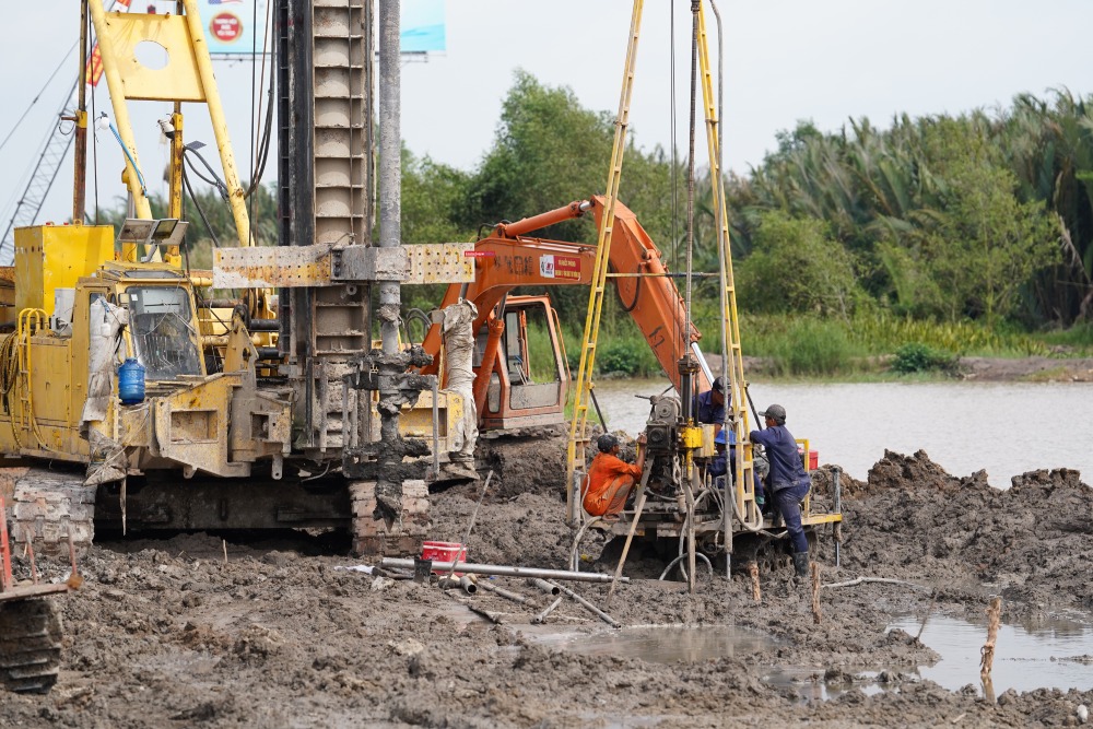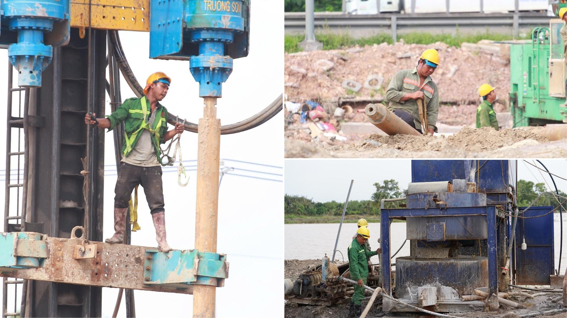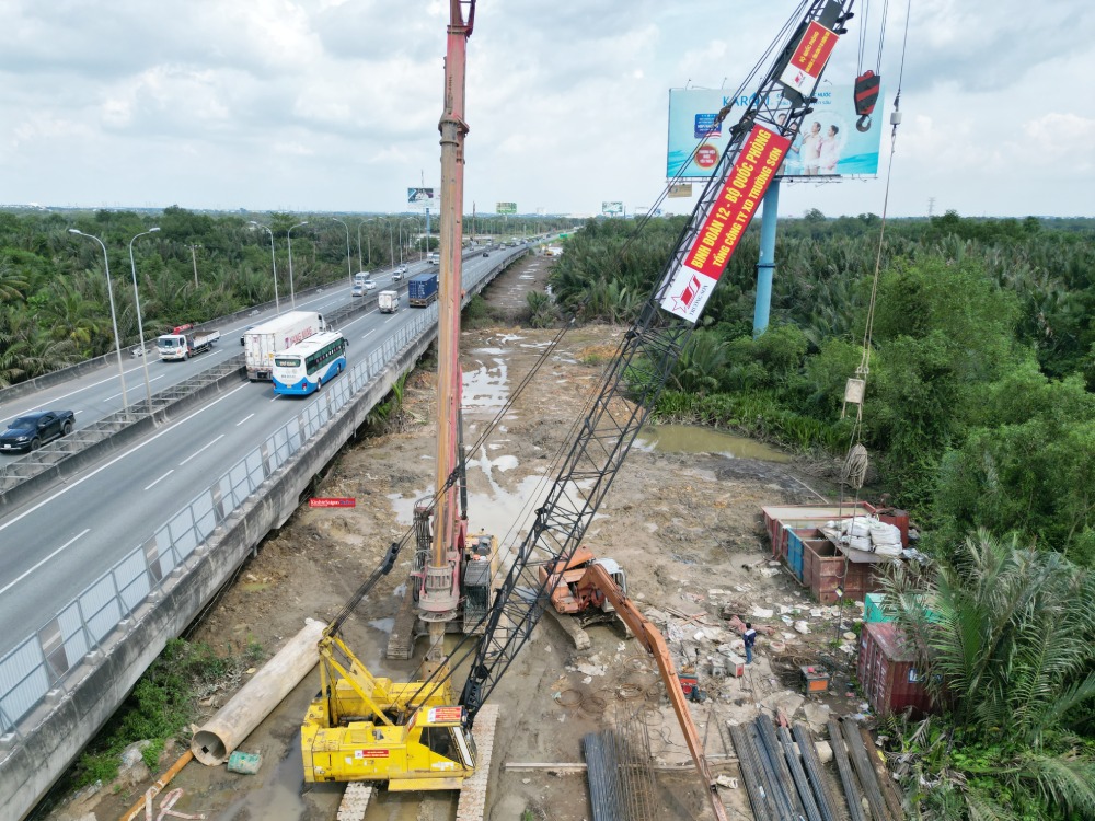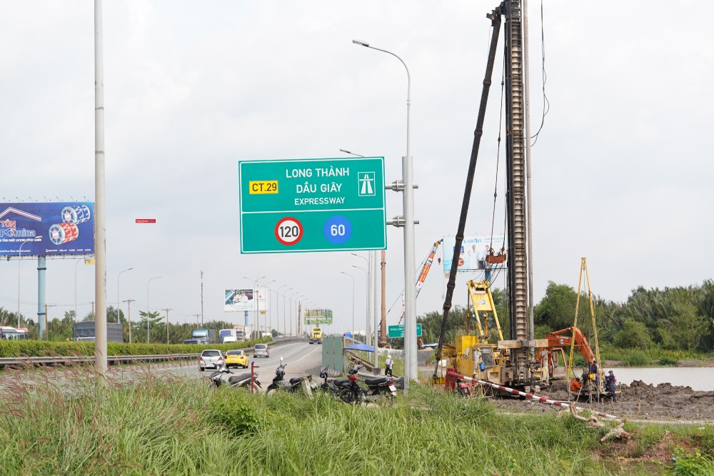 Tại khu vực cầu Long Thành, nhiều hố móng và cọc khoan nhồi đã được hạ xuống nền đất để chuẩn bị thi công cầu mở rộng.