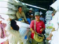 Chợt có một xe tải ghé vào, không khí trở nên ồn ào, sôi động hẳn lên. Một “lái gạo” nhảy vội xuống xe, tay cằm lăm lăm cây “xôm gạo” nhọn hoắt. Ngay lập tức, một nhóm vài chục phụ nữ bám theo, tay chìa “hàng mẫu” là bọc gạo nhỏ tranh nhau mời chào.