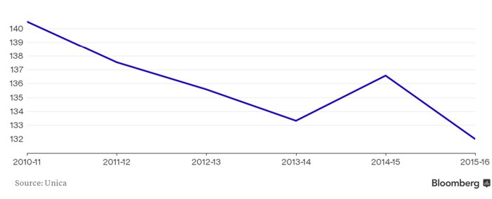 | Hàm lượng đường sucrose (kg/tấn) trong cây mía vùng Trung- Nam Brazil đang giảm xuống các mức thấp nhất trong 5 năm qua. |