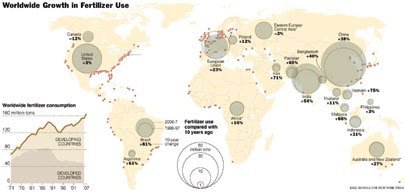 Theo Hiệp hội Công nghiệp Phân bón quốc tế, mức tiêu thụ phân hóa học trên toàn cầu từ năm 1996 đến nay tăng khoảng 31%, lên khoảng 160 triệu tấn vào năm ngoái (xem bản đồ).