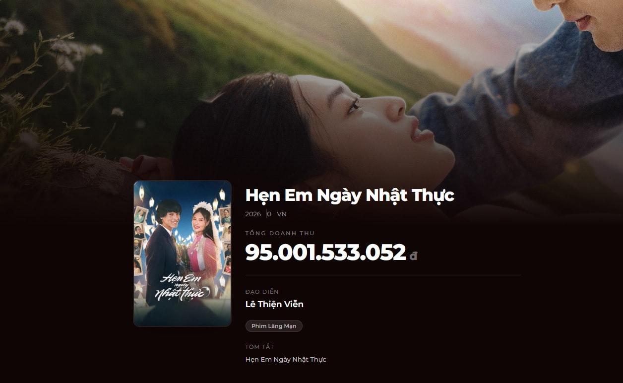 Theo Box Office Vietnam, ngày 13-4, phim "Hẹn em ngày nhật thực" của đạo diễn Lê Thiện Viễn đã đạt hơn 98 tỉ đồng. Dự kiến phim sẽ cán mốc 100 tỉ cùng ngày.