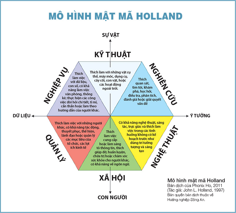 Chị Minh Đức giải thích một cách khoa học, mọi đặc điểm tự nhiên của trẻ đều được thể hiện trong Lý thuyết Mật mã Holland (Holland Code), công cụ được sử dụng rộng rãi trên thế giới từ những năm 1960 đến nay. Holland Code chia thiên hướng nghề nghiệp thành sáu nhóm: kỹ thuật, nghiên cứu, nghệ thuật, xã hội, quản lý và nghiệp vụ. Chúng ta thường có hai hoặc ba nhóm Holland thế mạnh. Các nhóm này sẽ giúp người đó dễ dàng phát triển theo những thiên hướng nghề nhất định.