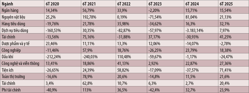 Đáng chú ý, sự tăng trưởng trong quí 2 không còn phân hóa mạnh như các quí trước. Các ngành dẫn đầu quí 2 so với cùng kỳ gồm dịch vụ tiêu dùng (+97,2%), tiện ích (+74,3%), hàng tiêu dùng (+53,2%) và tài chính (+53,2%). Y tế là ngành duy nhất sụt giảm lợi nhuận (-4,7%) so với cùng kỳ. Tính chung sáu tháng, ngành tiện ích (+71,4%), tài chính (+41,3%) và hàng tiêu dùng (+32,1%) tiếp tục giữ vị thế dẫn đầu, trong khi y tế (-2,8%) và dầu khí (-24,5%) tiếp tục giảm sút so với cùng kỳ.