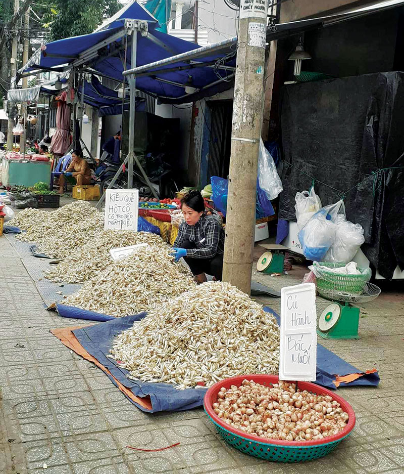 Thế rồi sau khi uống tách trà, ngắm chậu mai vội nở sớm vì thời tiết năm nhuận, tôi xách xe lang thang để xem thiên hạ mua bán những gì. Bên vỉa hè một cung đường nhỏ rợp bóng xà cừ, từng đống củ kiệu vun đầy cạnh đám hành tím cố nhoai lên để người ta lựa chọn. Ấy là hình ảnh Tết sớm của những người phụ nữ ở khắp các ngõ hẻm vội vã tìm đến, mua về kịp phơi vài ba ngọn nắng chuẩn bị cho hũ hành hũ kiệu, để đó chờ phút đoàn viên năm mới.
