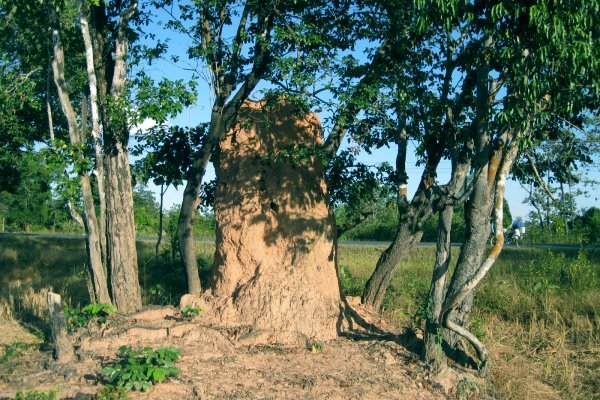 | Những ổ đất mối xông thành đụn cao như cây cột nằm dọc cánh đồng gần Si Phan Don. |