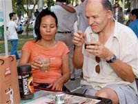 | Hai du khách đến từ Pháp thưởng thức cà phê tại Tuần lễ văn hóa cà phê tại Tao Đàn - Ảnh: Hữu Thắng |