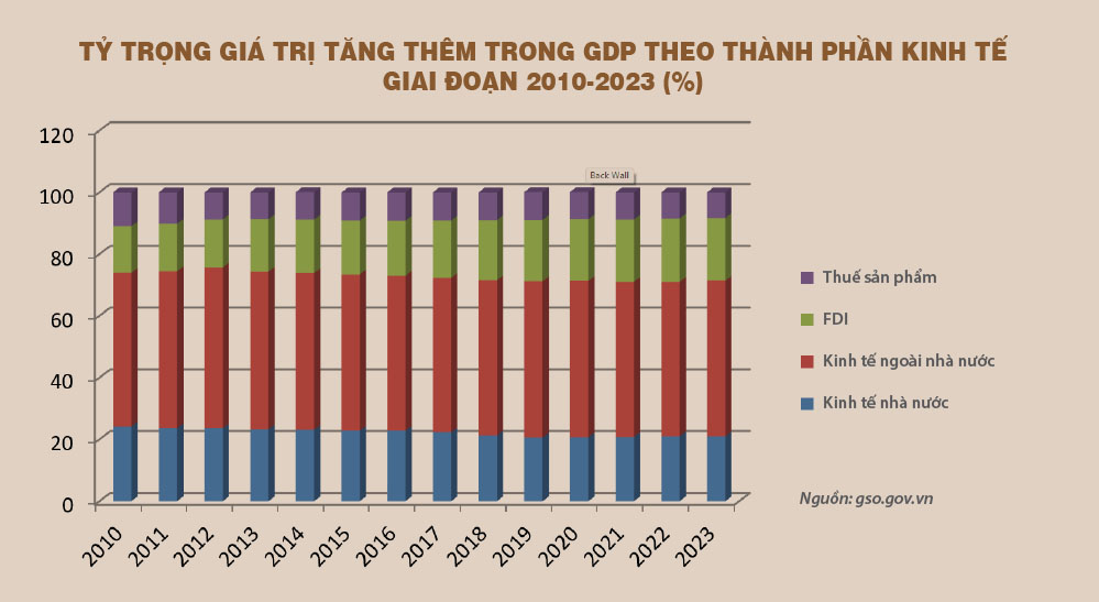 Tuy khu vực kinh tế ngoài nhà nước gần như không thay đổi nhưng trong nội hàm của nó có sự thay đổi đáng kể. Số liệu điều tra doanh nghiệp cho thấy tỷ trọng giá trị tăng thêm trong GDP của khu vực kinh tế tư nhân (doanh nghiệp tư nhân) tăng từ khoảng 22% GDP năm 2010 lên 28% GDP năm 2023 (tăng 6 điểm phần trăm) và tỷ trọng giá trị tăng thêm trong GDP của khu vực kinh tế cá thể giảm tương ứng 6% (27% năm 2010 còn khoảng 21% năm 2023). Điều này phải chăng do các hộ kinh doanh cá thể chuyển thành doanh nghiệp? Nếu như vậy nó không làm tỷ trọng giá trị tăng thêm trong GDP của khu vực kinh tế ngoài nhà nước tăng lên, mà chỉ là sự chuyển đổi từ loại hình sở hữu cá thể sang loại hình sở hữu kinh tế tư nhân (doanh nghiệp) trong khu vực kinh tế ngoài nhà nước mà thôi.