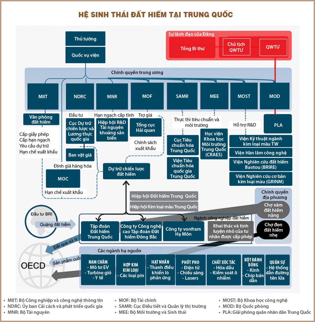 Thứ hai, về mặt bộ máy tổ chức, cả chính quyền trung ương, chính quyền địa phương và gần đây là các công ty hạ nguồn tư nhân, đã dành nhiều thập niên để phát triển một chuỗi giá trị trọn vẹn bên trong lãnh thổ Trung Quốc (xem hình). Tài nguyên đất hiếm của Trung Quốc tập trung ở Nội Mông (Baotou), chiếm 58% sản lượng quốc gia, tiếp theo là Tứ Xuyên (Liangshan) chiếm 23% sản lượng. Chính phủ nước này đã định hình ngành công nghiệp này thông qua hai làn sóng hợp nhất. Làn sóng đầu tiên hoàn thành trong những năm 2010 đã tạo ra sáu doanh nghiệp nhà nước lớn do trung ương hoặc do tỉnh sở hữu. Vào cuối năm 2021, Trung Quốc đã củng cố thêm ngành công nghiệp này bằng cách kết hợp China Minmetals Rare Earth Co., Ltd., Chinalco Rare Earth and Metals Co., Ltd., và China Southern Rare Earth Group Co. Ltd., cùng với hai công ty nhỏ hơn - Ganzhou Zhonglan Rare Earth New Material Technology và Jiangxi Ganzhou Rare Metal Exchange - để tạo ra Tập đoàn Đất hiếm Trung Quốc (China Rare Earth Group - CREG ). CREG là nhà sản xuất đất hiếm lớn thứ hai trên toàn cầu, kiểm soát khoảng 28% hạn ngạch khai thác và chiết xuất của Trung Quốc và 60-70% sản lượng đất hiếm nặng có giá trị cao của nước này.