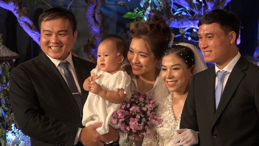 Đám cưới của bác sĩ Thu Hằng còn có điểm đặc biệt là ngoài sự chia vui và chúc phúc của gia đình, bạn bè còn có sự góp mặt của cô con gái An Nhi vừa tròn 1 tuổi. Vì dịch bệnh, bác sĩ Thu Hằng đã hoãn tổ chức đám cưới hai lần vào năm 2020 và 2021. Trong số 20 cặp đôi được tổ chức lễ cưới vào tối 20-2, có ba cặp đôi đã có con nhỏ, đây là các em bé được sinh ra trong giai đoạn nóng bỏng của những ngày TPHCM gồng mình chống dịch.
