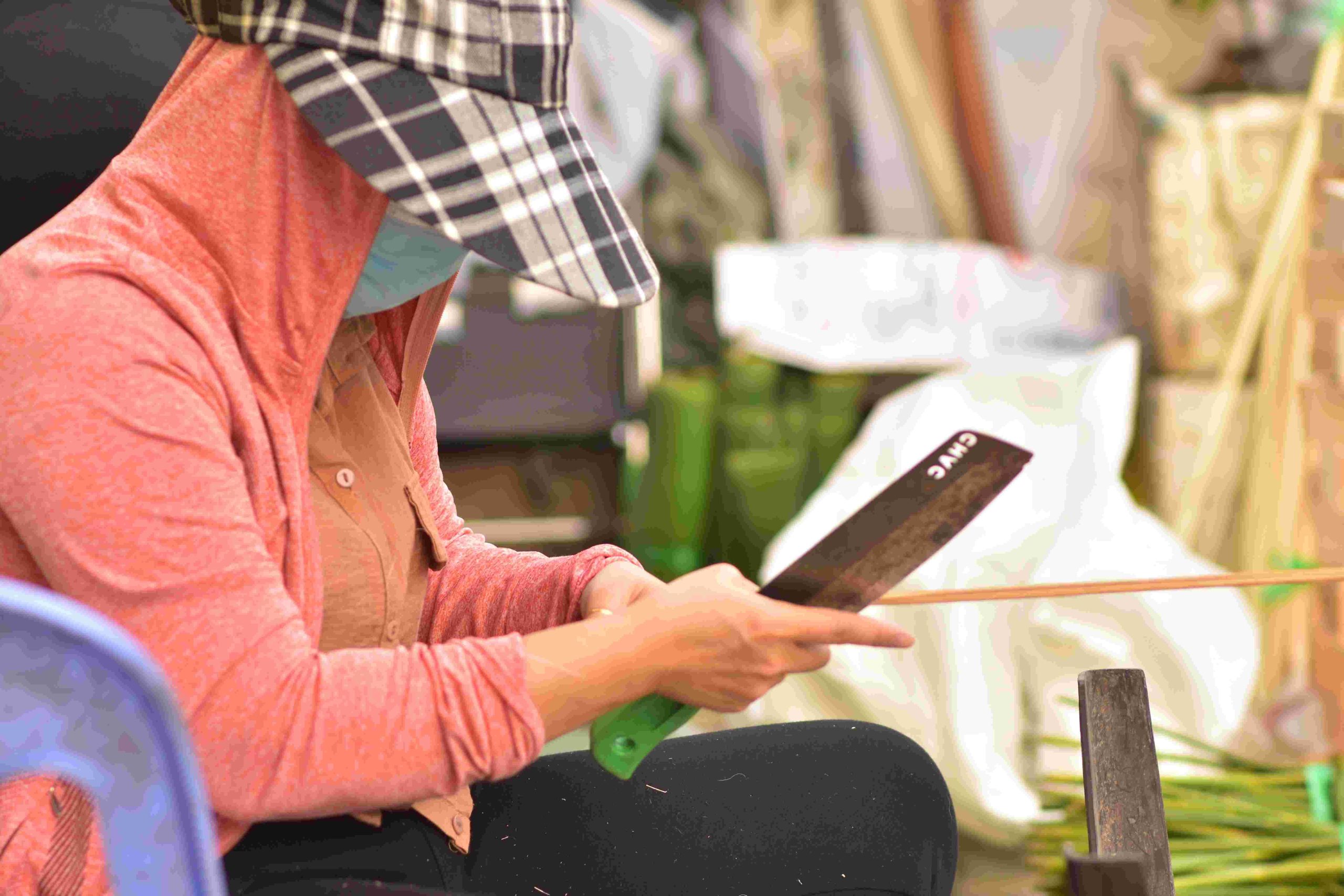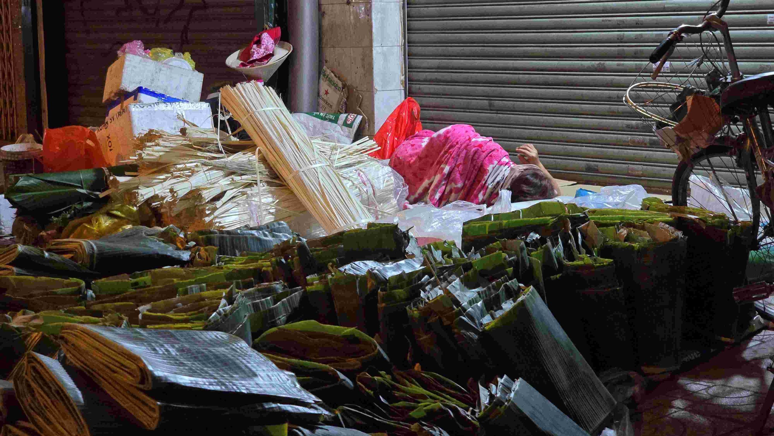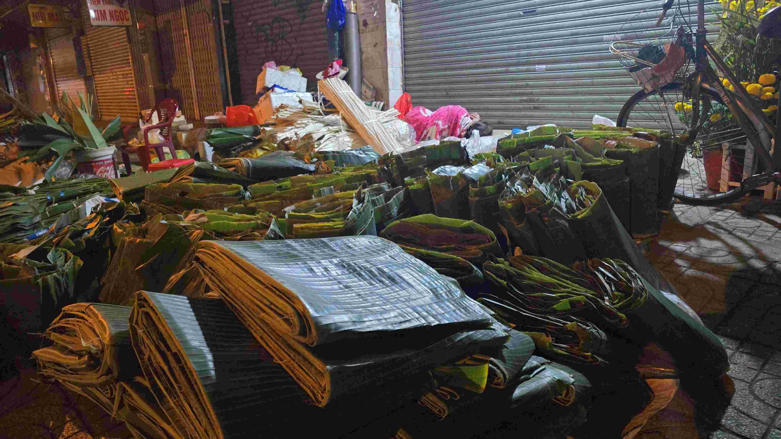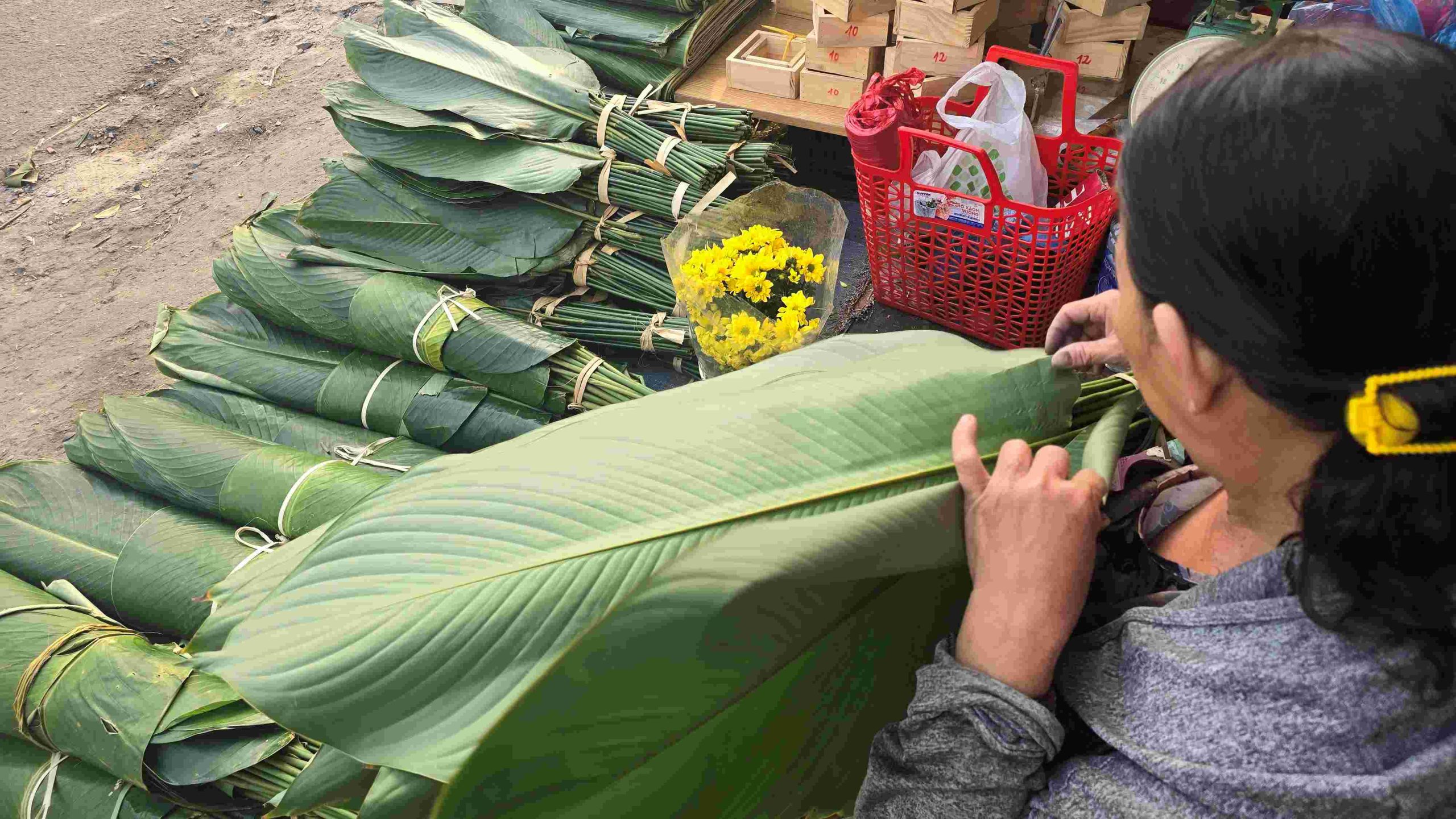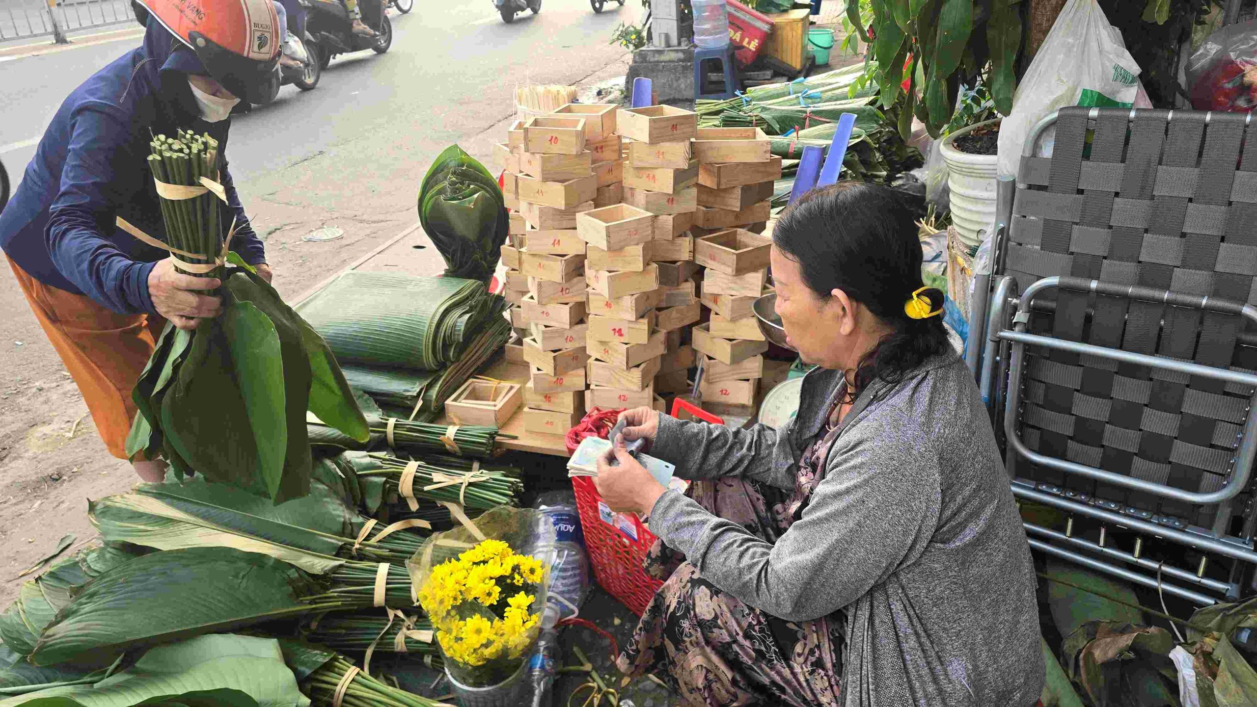 Công đoạn chuốt dây lá được thực hiện thủ công ngay tại điểm bán.Những vật dụng để gói bánh tét, bánh chưng mùa Tết như khuôn, dây buộc... được bày bán cùng lá chuối, lá dong giúp người dân dễ dàng chọn mua.Để có những bó lá đến tay người tiêu dùng, người bán phải tập kết, vận chuyển và sắp xếp hàng hóa từ tối hôm trước.