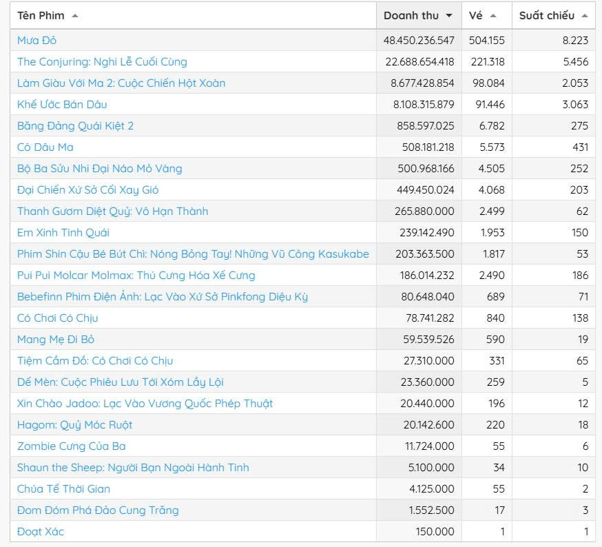 Xếp sau phim 'Mưa đỏ', bom tấn kinh dị 'The Conjuring: Nghi lễ cuối cùng của Hollywood'vừa ra rạp hôm 12-9 đã giành ngôi á quân với hơn 22 tỉ đồng doanh thu từ hơn 215.000 vé bán ra.