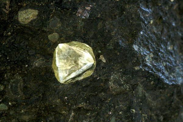 | Một viên kim cương vàng nằm giữa khối đá mắc ma Kimberlite được tìm thấy ở Nam Phi. Kimberley 8 mặt 616 carat – một trong những viên kim cương lớn nhất thế giới - là kim cương vàng. |