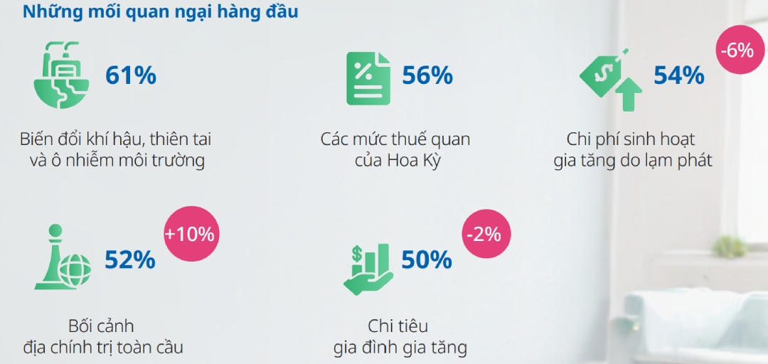 Các lo lắng của người tiêu dùng trong năm ngoái như lạm phát, đều giảm đi trong báo cáo khảo sát của năm nay. Cụ thể, lo ngại về chi phí sinh hoạt gia tăng do lạm phát giảm 6 điểm phần trăm, chi tiêu gia đình giảm 2 điểm phần trăm. Ngược lại, lo ngại về bối cảnh địa chính trị toàn cầu lại tăng 10 điểm phần trăm.