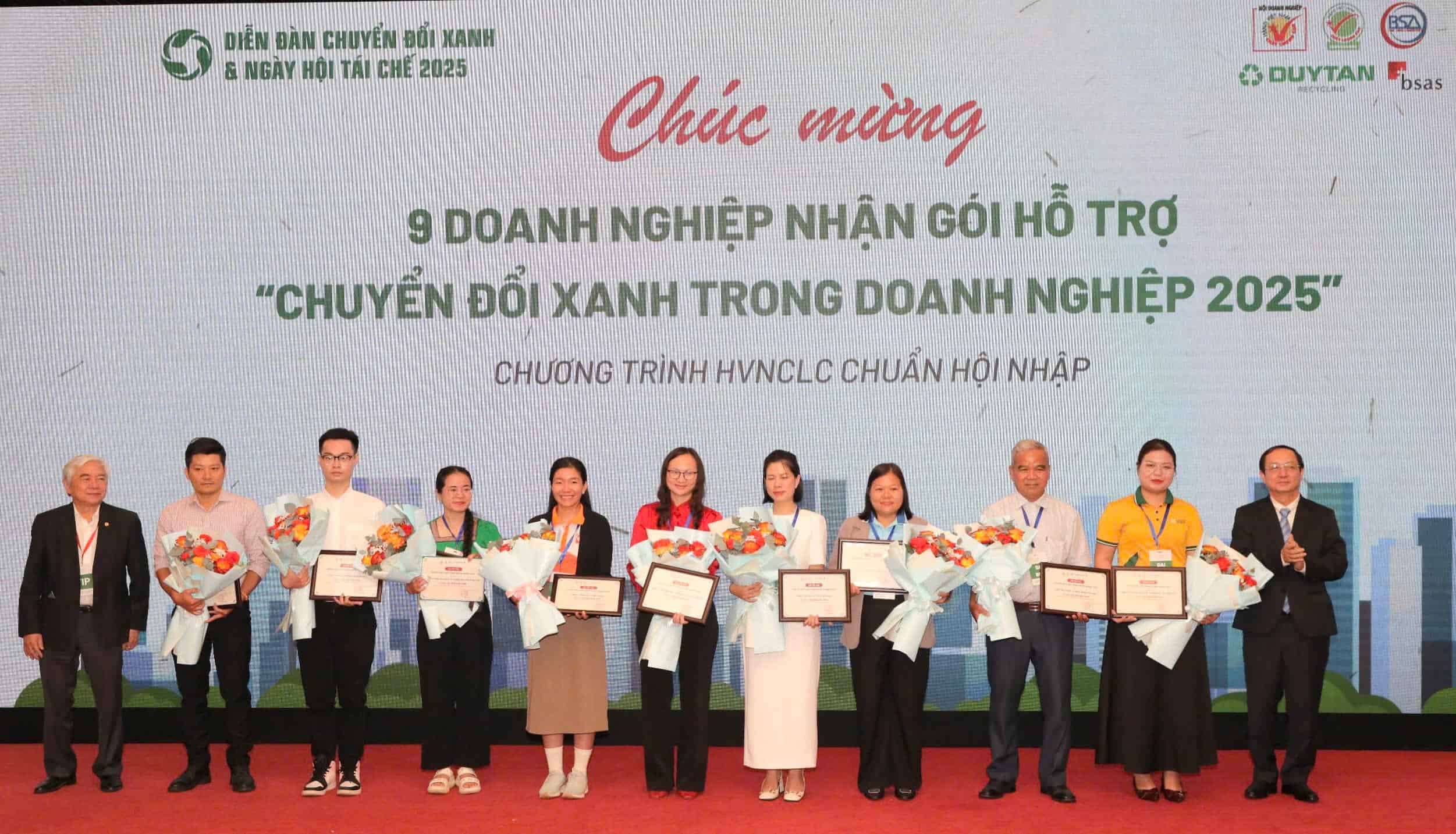 Một trong những điểm nhấn của diễn đàn là lễ công bố và trao gói hỗ trợ “Chuyển đổi xanh trong doanh nghiệp 2025” trị giá hơn 1 tỉ đồng cho 9 doanh nghiệp vừa và nhỏ. Gói hỗ trợ này nhằm giúp các doanh nghiệp nâng cao hệ thống quản lý chất lượng, đáp ứng yêu cầu thị trường xuất khẩu, giảm phát thải và hướng đến một nền kinh tế tuần hoàn, bền vững, thân thiện với môi trường.