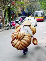 “Tôi tranh thủ dăm bữa đánh liều vừa bán vừa nghe ngóng nhưng rồi cũng phải về thôi chú ạ. Bán chui bán lủi như thế run lắm, nhác thấy bóng mấy chú công an là tôi tái người vì sợ. Nghề bán hàng rong lúc cười lúc khóc. Hồi còn ở Hà Nội ngày nào tôi cũng dậy từ hai giờ sáng đi chợ Long Biên mua hàng. Một ngày tất tật chỉ dám tiêu 40.000 đồng, ba bữa ăn đã mất 21.000 đồng, thuê trọ 5.000 đồng, tiền mua bao nilon, tiền gửi quang gánh... Nhà tôi trước có hai sào ruộng nhưng hai năm trước chỉ còn một sào vì đất bị thu để làm nhà máy”.