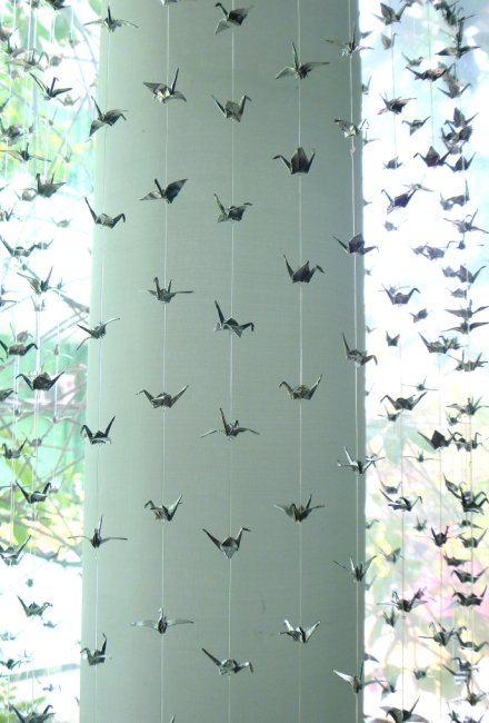 | Những con hạc giấy được xếp đầy dưới các bàn kính trong suốt |