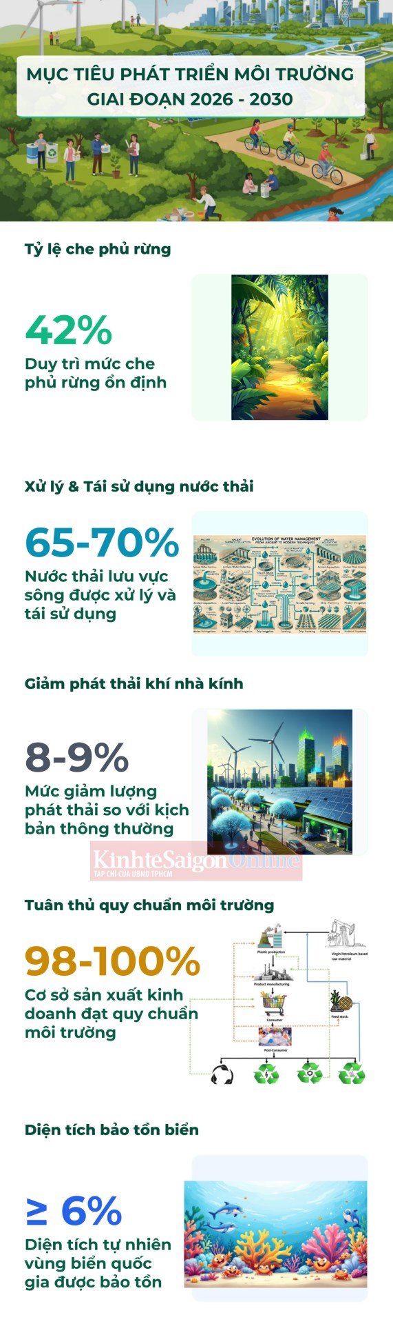 (KTSG Online) - Tỷ lệ che phủ rừng ở mức 42% hay lượng phát thải khí nhà kính giảm 8-9% là hai trong số các mục tiêu chính về phát triển môi trường mà Việt Nam nhắm tới trong giai đoạn 2026-2030. Những mục tiêu này được đề cập trong Nghị quyết Đại hội đại biểu toàn quốc lần thứ XIV của Đảng.