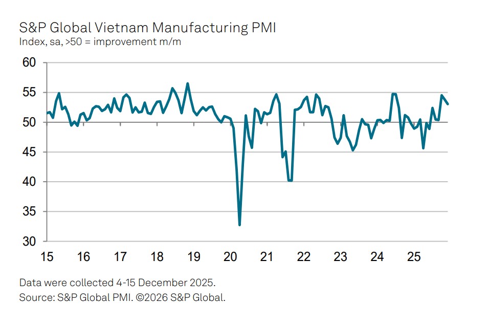 Trong tháng 12-2025, PMI ngành sản xuất đạt 53 điểm, giảm nhẹ so với mức 53,8 điểm của tháng 11 nhưng vẫn duy trì vững trên ngưỡng 50 điểm, ngưỡng phản ánh sự mở rộng của hoạt động sản xuất. Đây cũng là tháng thứ 6 liên tiếp chỉ số này cho thấy xu hướng tăng trưởng ổn định của khu vực sản xuất.