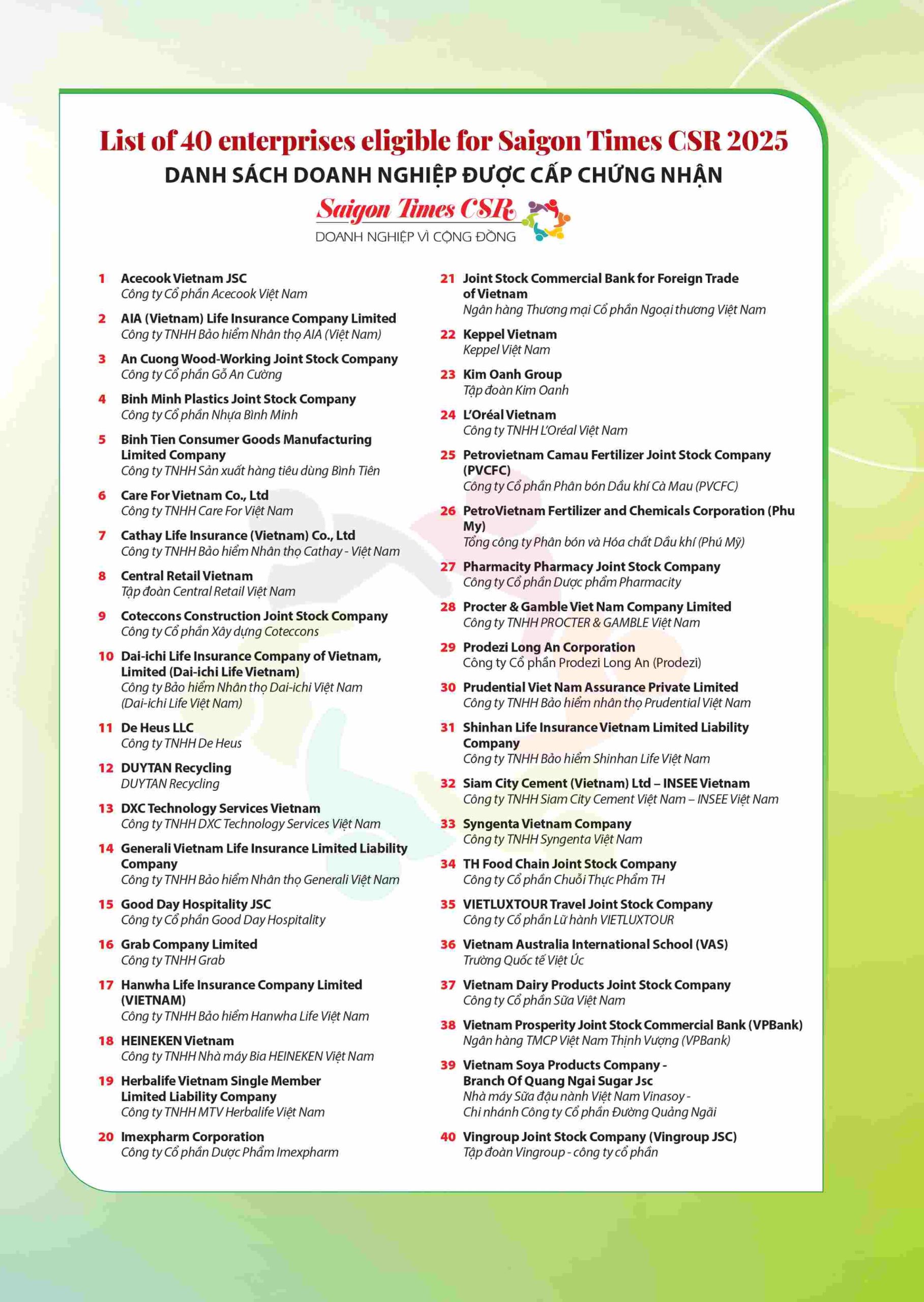 40 DOANH NGHIỆP ĐƯỢC VINH DANH SAIGON TIMES CSR 2025